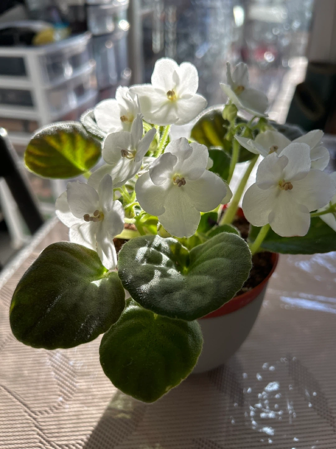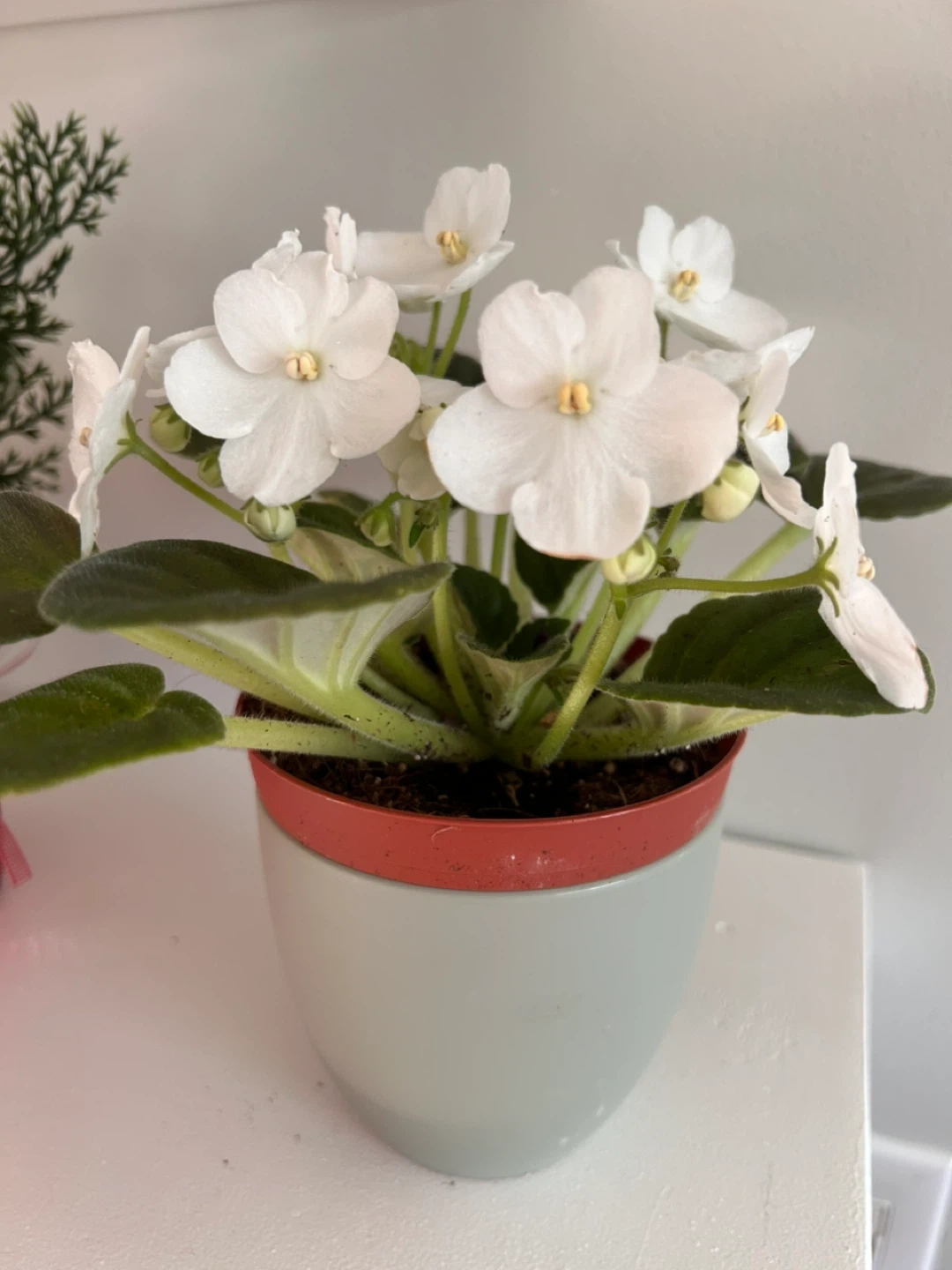 A lovely rare white African violet in a 3.5” sage ceramic pot.