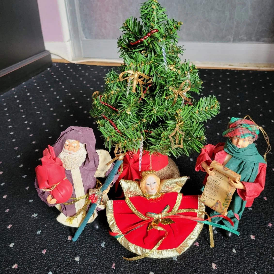 Here's a charming set of Christmas ornaments, perfect for adding a touch of festive cheer to your home this holiday season! Included are a small Christmas Green Tree with a Burlap Tree Skirt, a Velvet Angel tree decoration, a paper mache Santa, and a paper mache caroller ornament.