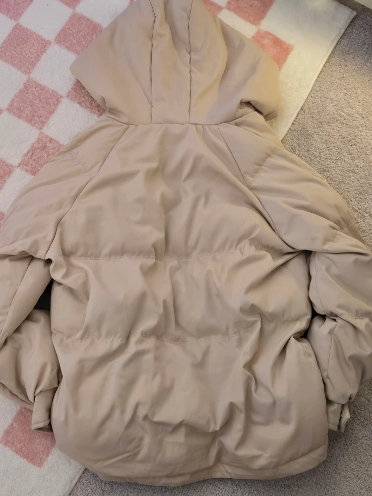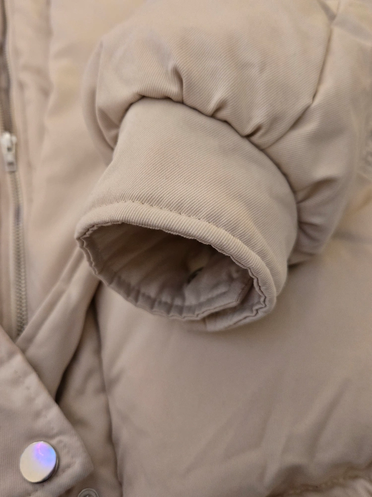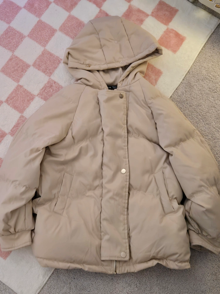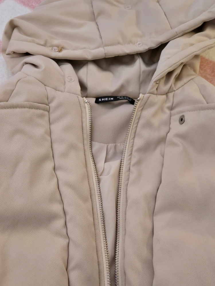 SHEIN puffer jacket in a lovely beige colour. It has a hood, zipper and buttons, and cinchable bottom. Barely worn, waterproof, in great condition.
