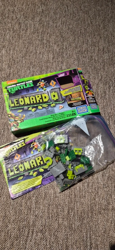 Selling a Teenage Mutant Ninja Turtles Leonardo Mega Bloks set! It's suitable for ages 6+. The box says it contains 233 pieces. Includes the box and instructions.