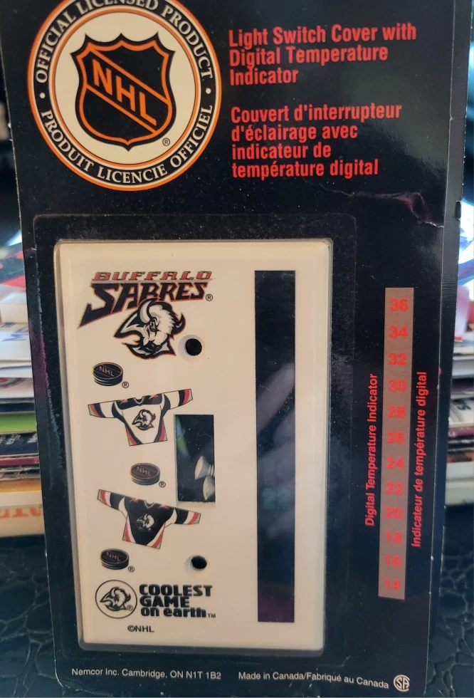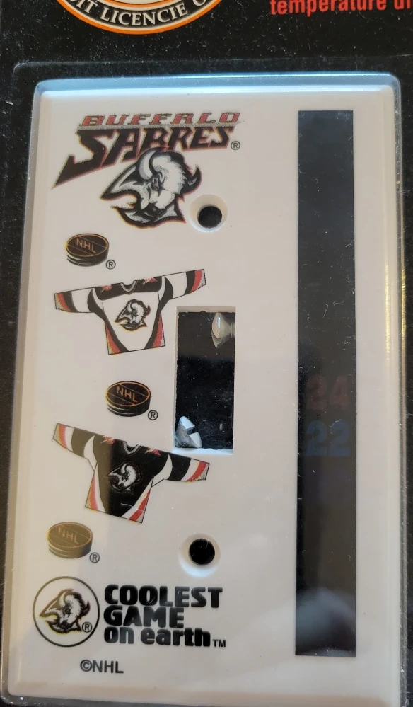 Selling a Buffalo Sabres light switch cover with a digital temperature indicator. It's an official NHL licensed product and made in Canada! It's a fun way to show your team spirit. Great stocking stuffer!