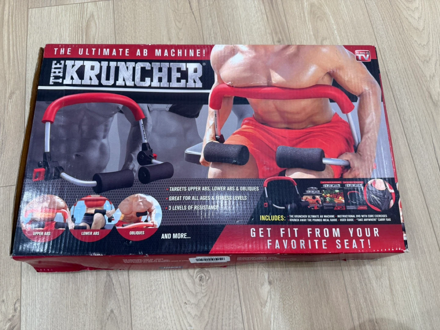 Get fit from your favourite seat with The Kruncher! This ultimate ab machine targets upper abs, lower abs, and obliques. It's great for all ages and fitness levels and has 3 levels of resistance. Includes instructional DVD with core exercises, Krunch Away the Pounds meal guide, user guide, and a "take anywhere" carry bag