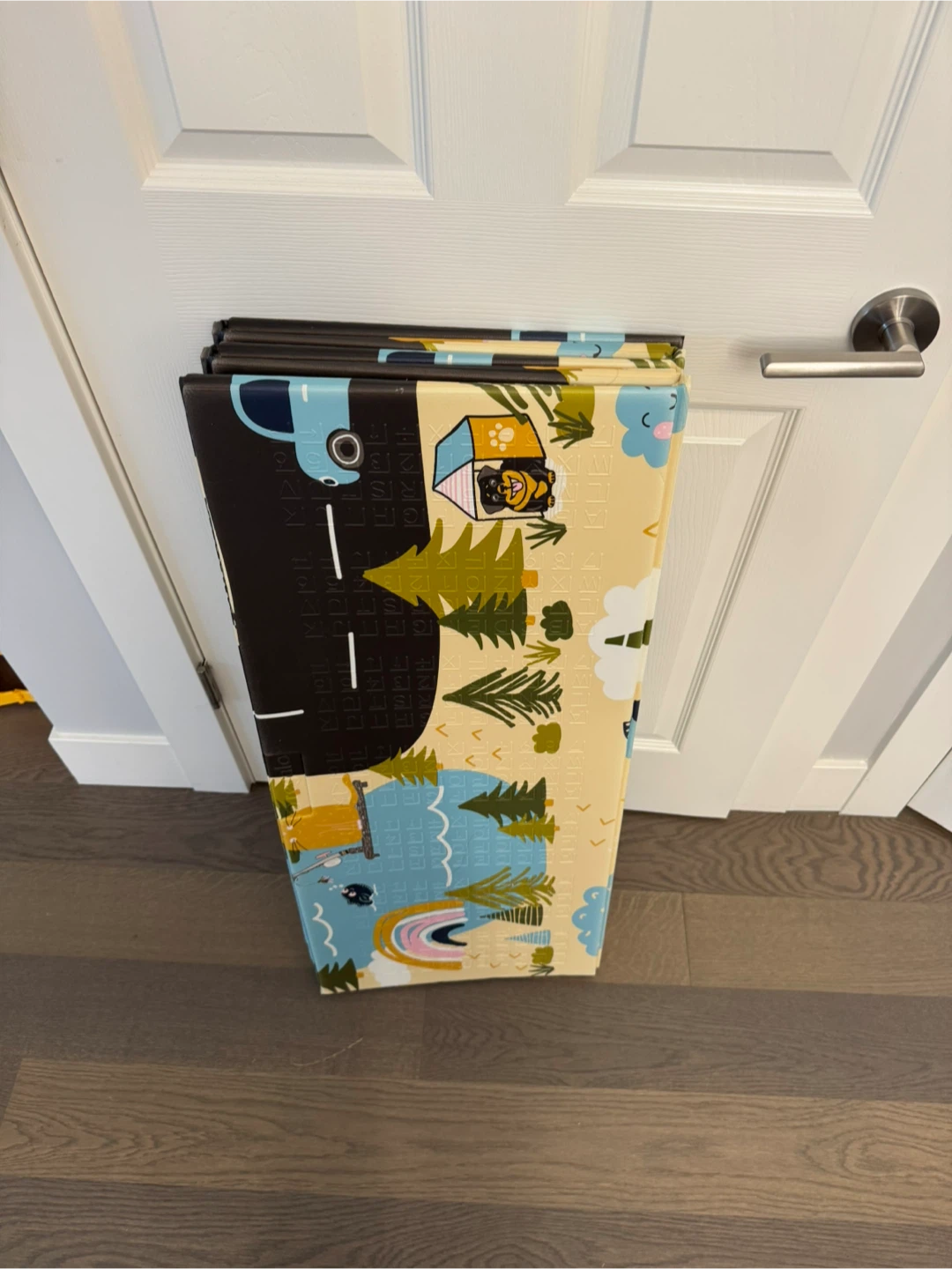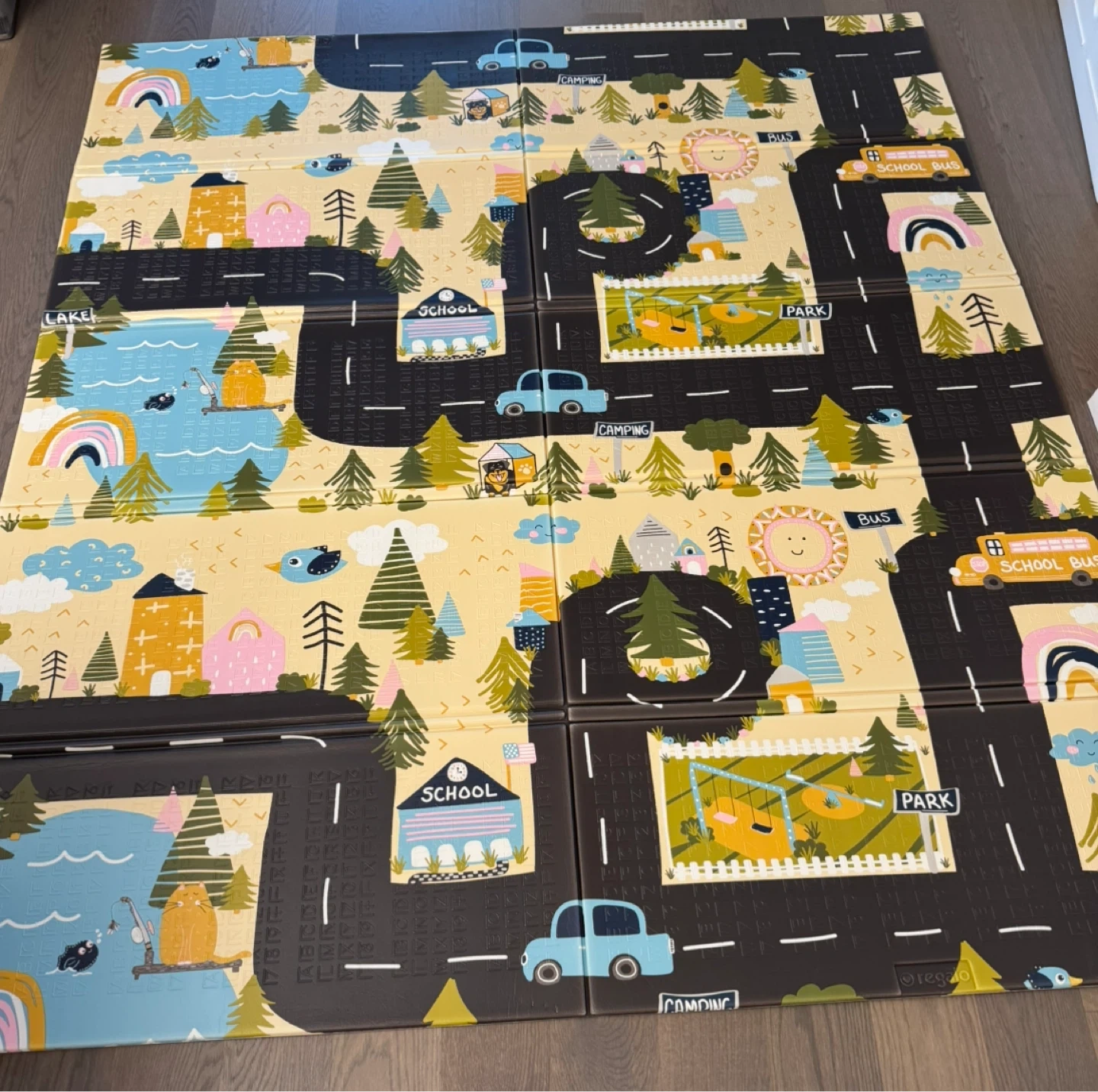 Play mat featuring a colourful city design on one side and ABC pattern on the other. Great for tummy time and playtime in bed room or living rooms. It can be folded into smaller sizes for travel and storage.