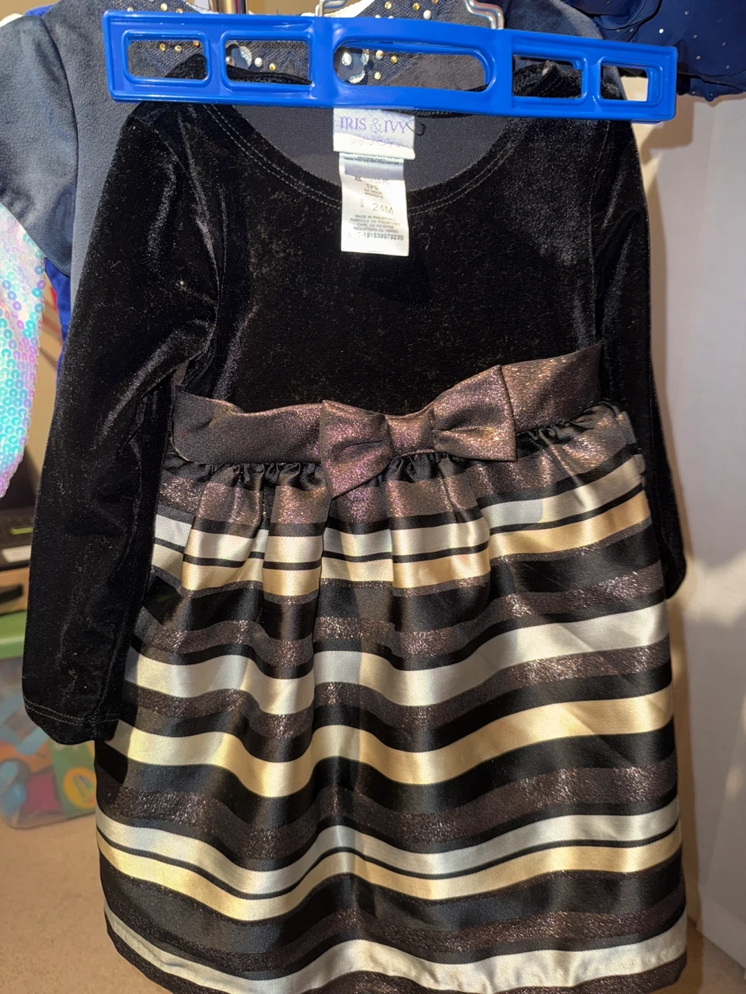 A cute Iris & Ivy dress for your little one! It's a size 24M and features a black velvet top with a striped skirt and a bow at the waist. Perfect for parties or special occasions