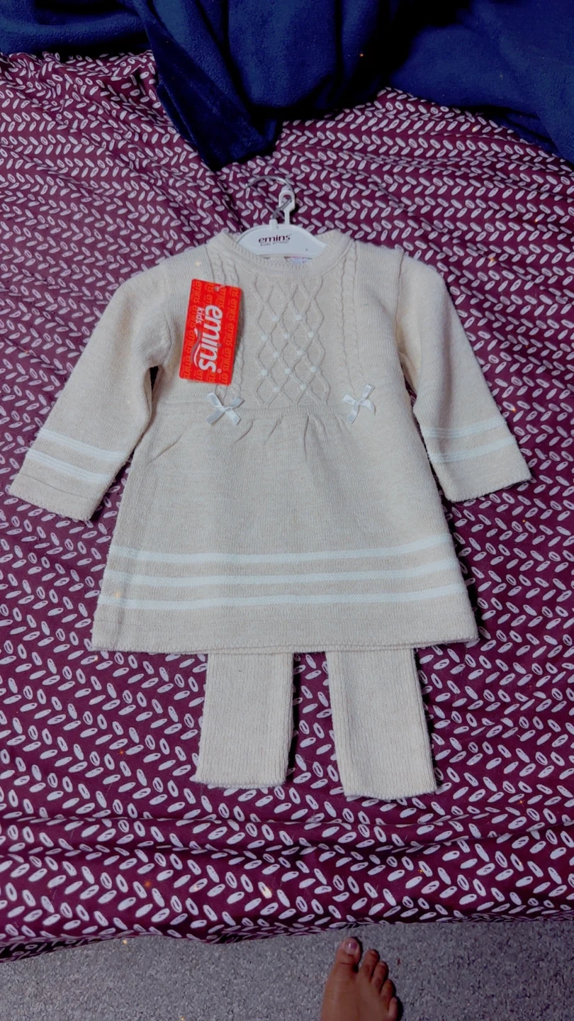 This adorable Emns Kids knit dress and leggings set is perfect for your little one! The set features a beige knit dress with cute detailing and matching leggings. It's in great condition and ready for a new home