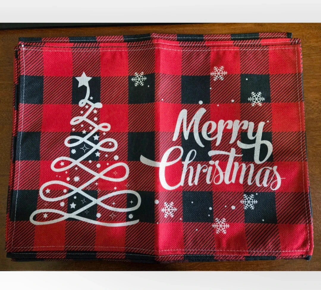 - Add a festive touch to your holiday dining table with this YCbingo Set of 6 Christmas Placemats. Each placemat measures 12.5 x 8 inches and features a charming red and black buffalo plaid design combined with natural burlap accents for a cozy farmhouse look. Made from durable cotton and burlap materials, these placemats are easy to clean, heat-resistant, and waterproof—perfect for protecting your table during family dinners, Christmas parties, and festive gatherings. Ideal for everyday use throughout the holiday season, they bring warmth, style, and practicality to your Christmas décor.