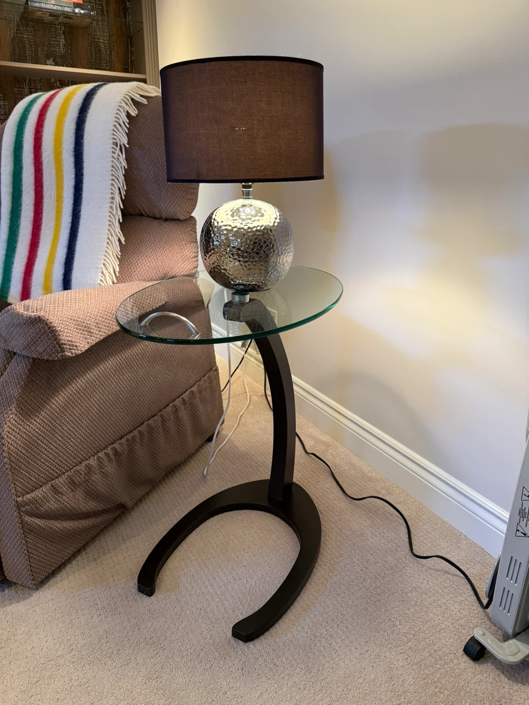 It has a modern design with a clear glass top and a dark wood base. It's in great shape and would be a stylish addition to any room.