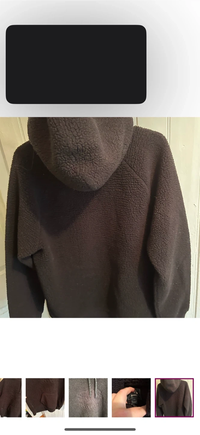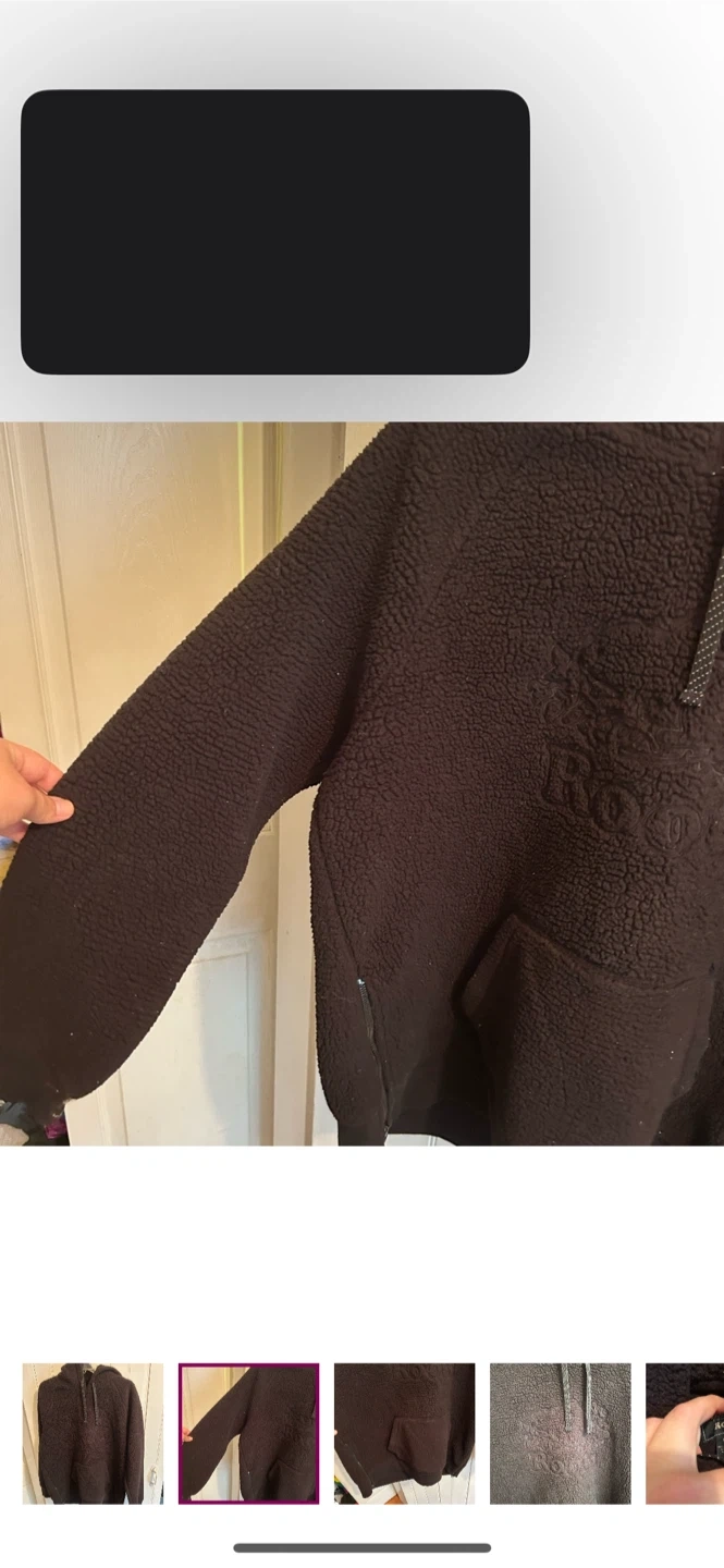 Roots brand. Pullover Sherpa hoodie with side zippers. Black with embroidered logo. Size women’s large. Brand new condition but every fizzy thing sticks to it.
