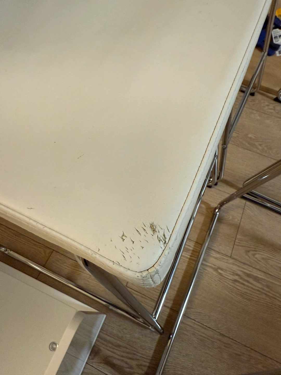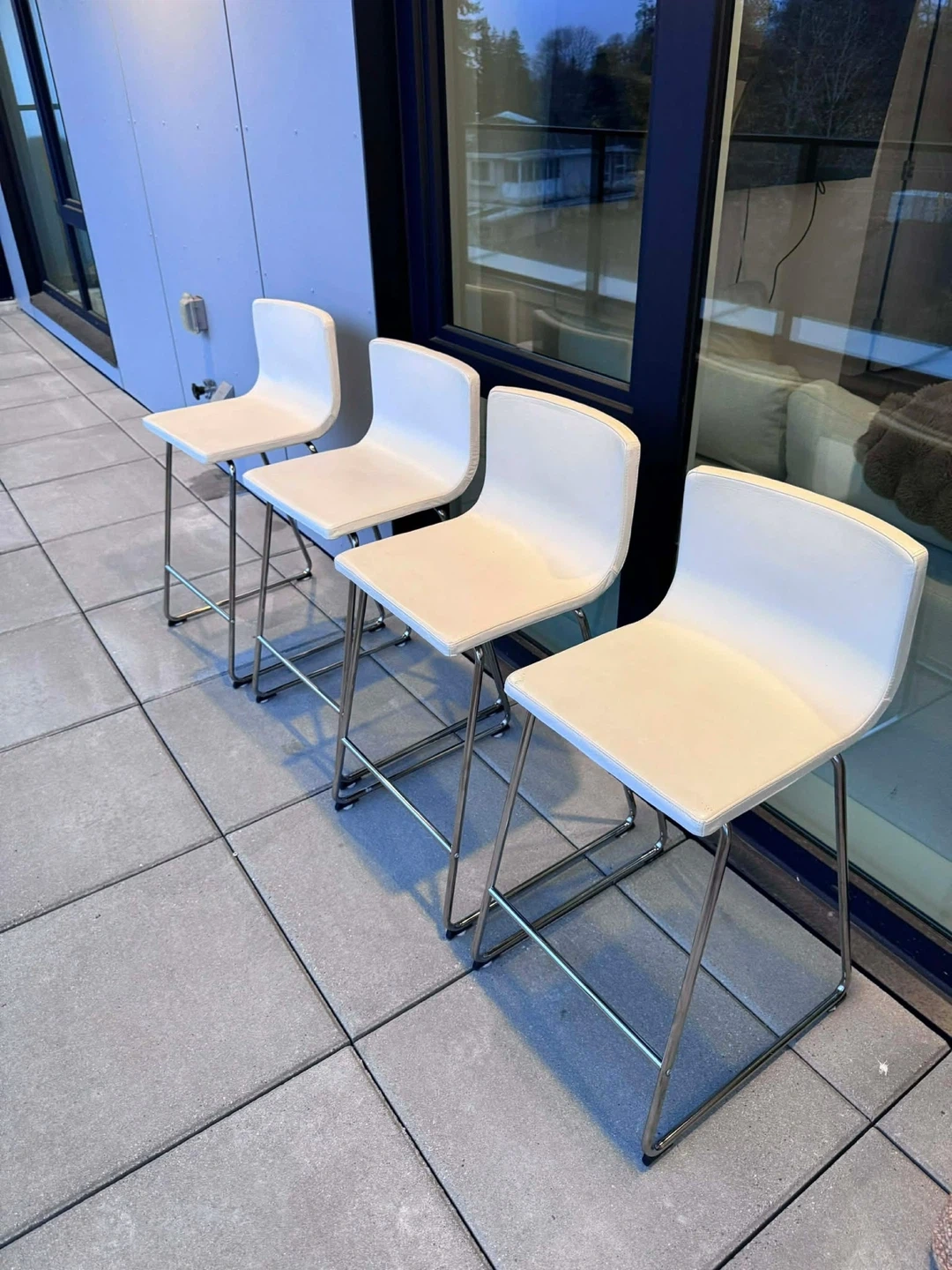 Selling a set of 4 bar stools. They have a white seat and a chrome frame. There are some signs of wear and tear on the seats, as shown in the pictures.