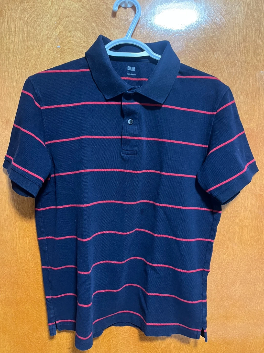 Selling a Uniqlo polo shirt in size L. It's a navy blue color with red stripes. Perfect for casual wear