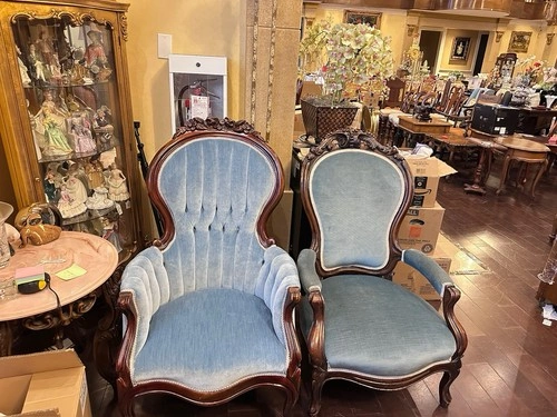 A set of vintage French Rococo Revival chairs with solid wood frames and blue pinstripe cotton upholstery. Comfortable, lightweight, and fully assembled—perfect for any living room, office, or bedroom.