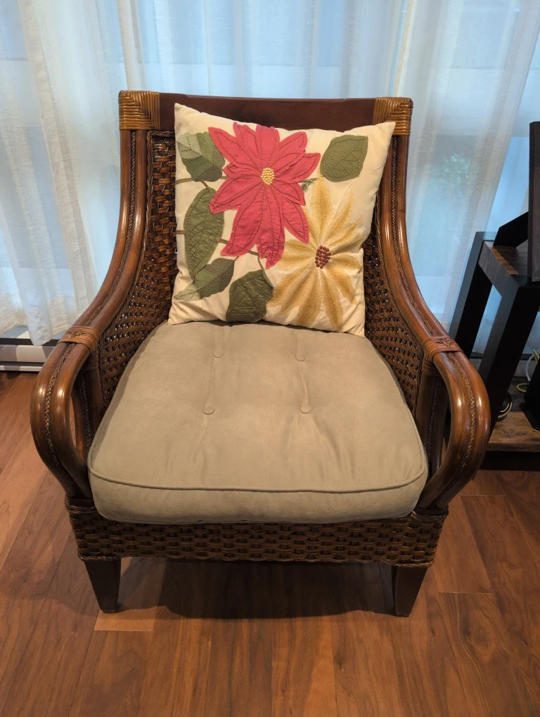 Selling a lovely wicker chair that would look great in any home! It comes with a comfy floral pillow, perfect for adding a touch of charm to your living space or sunroom. The chair is in good condition and ready for a new home!