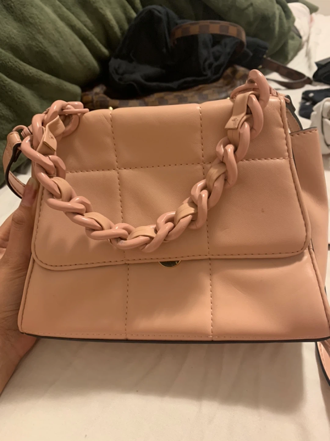 This is a cute pink Ardene crossbody bag with a chain detail! It's in great condition and would be a great addition to your wardrobe