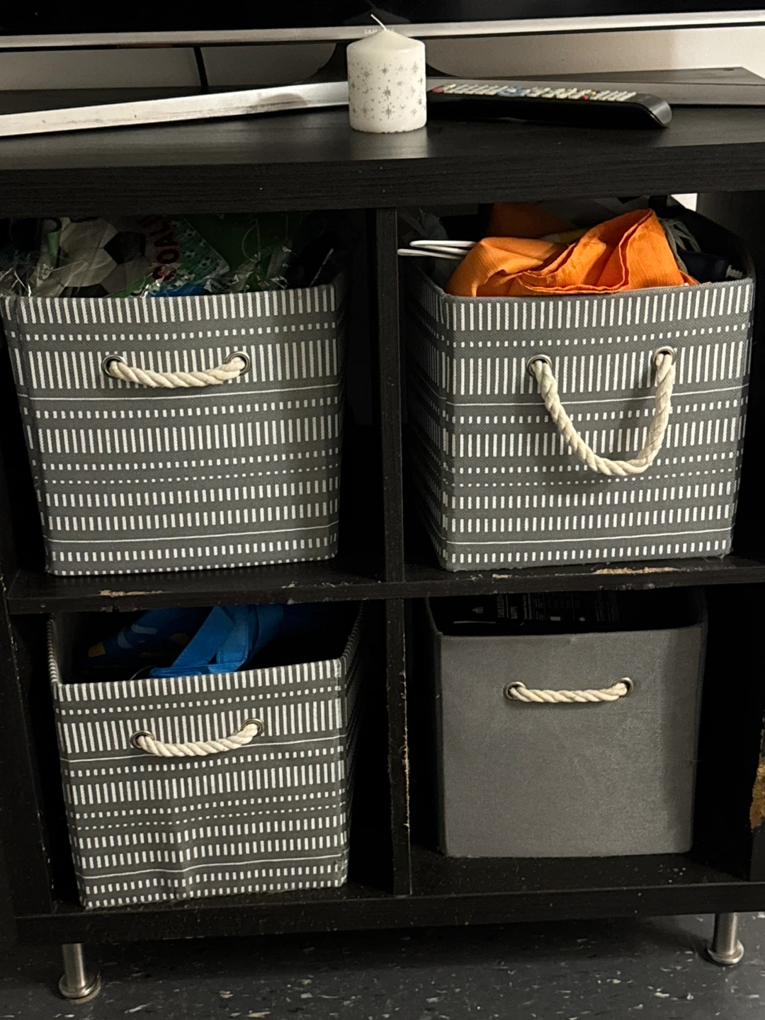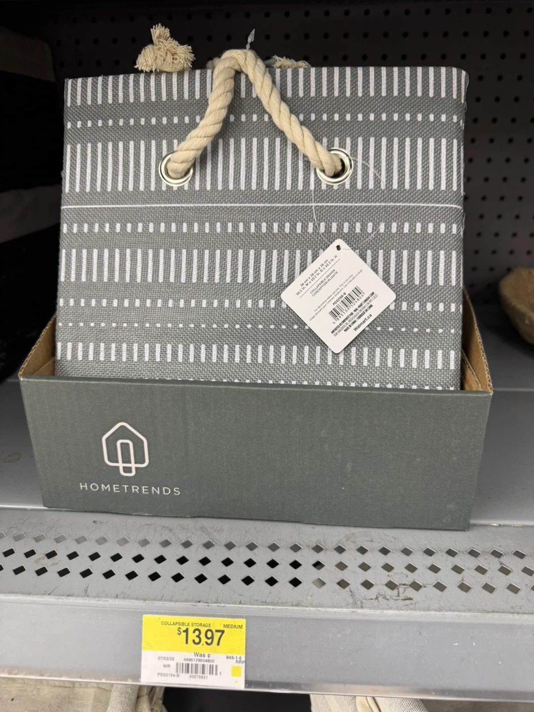 Here’s a handy storage bin from Home Trends! It features a stylish grey and white pattern with a rope handle. Perfect for organizing your space!