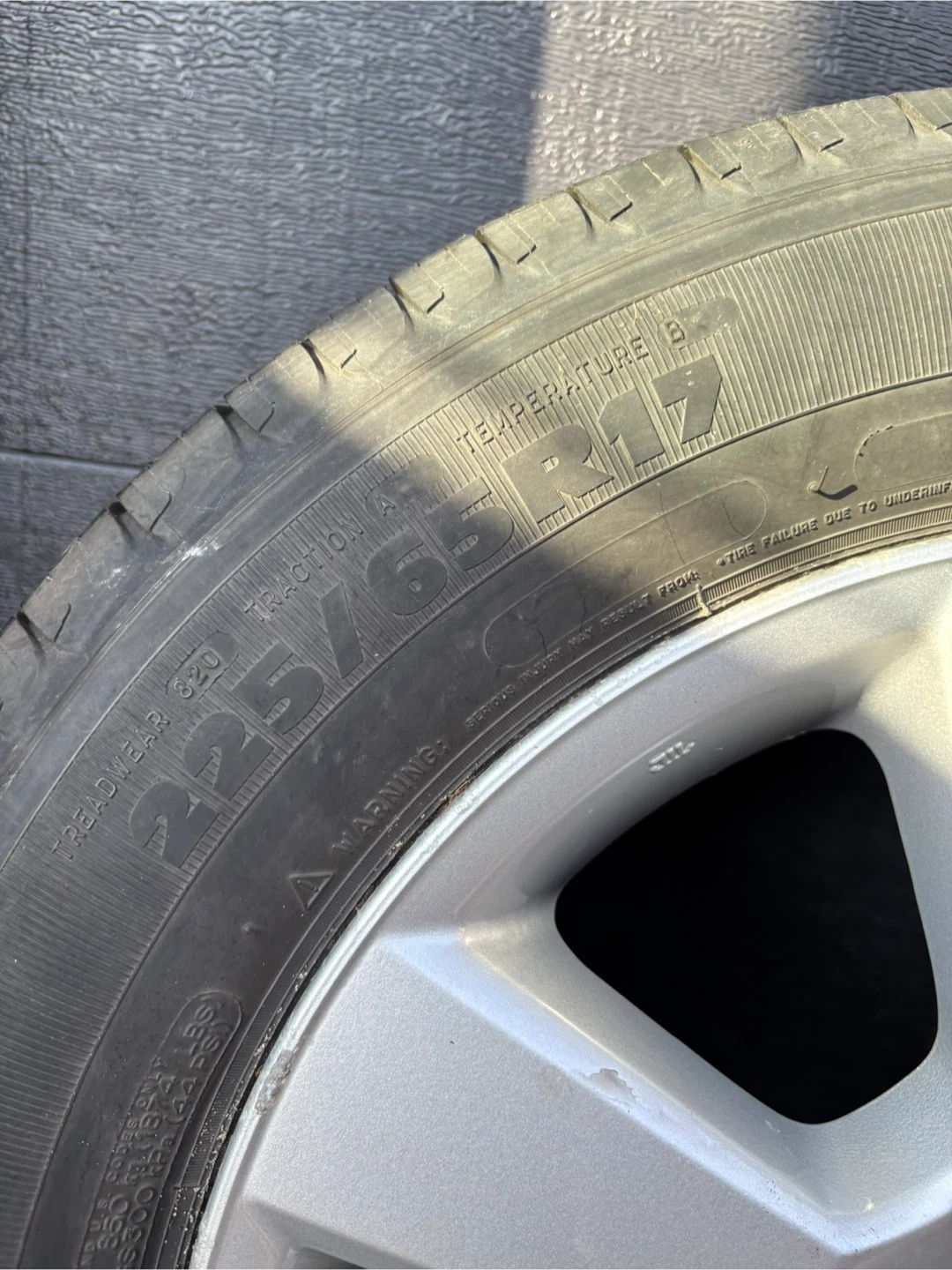 225/65R17 102T. The tire is a Michelin Green X All Season great tire.