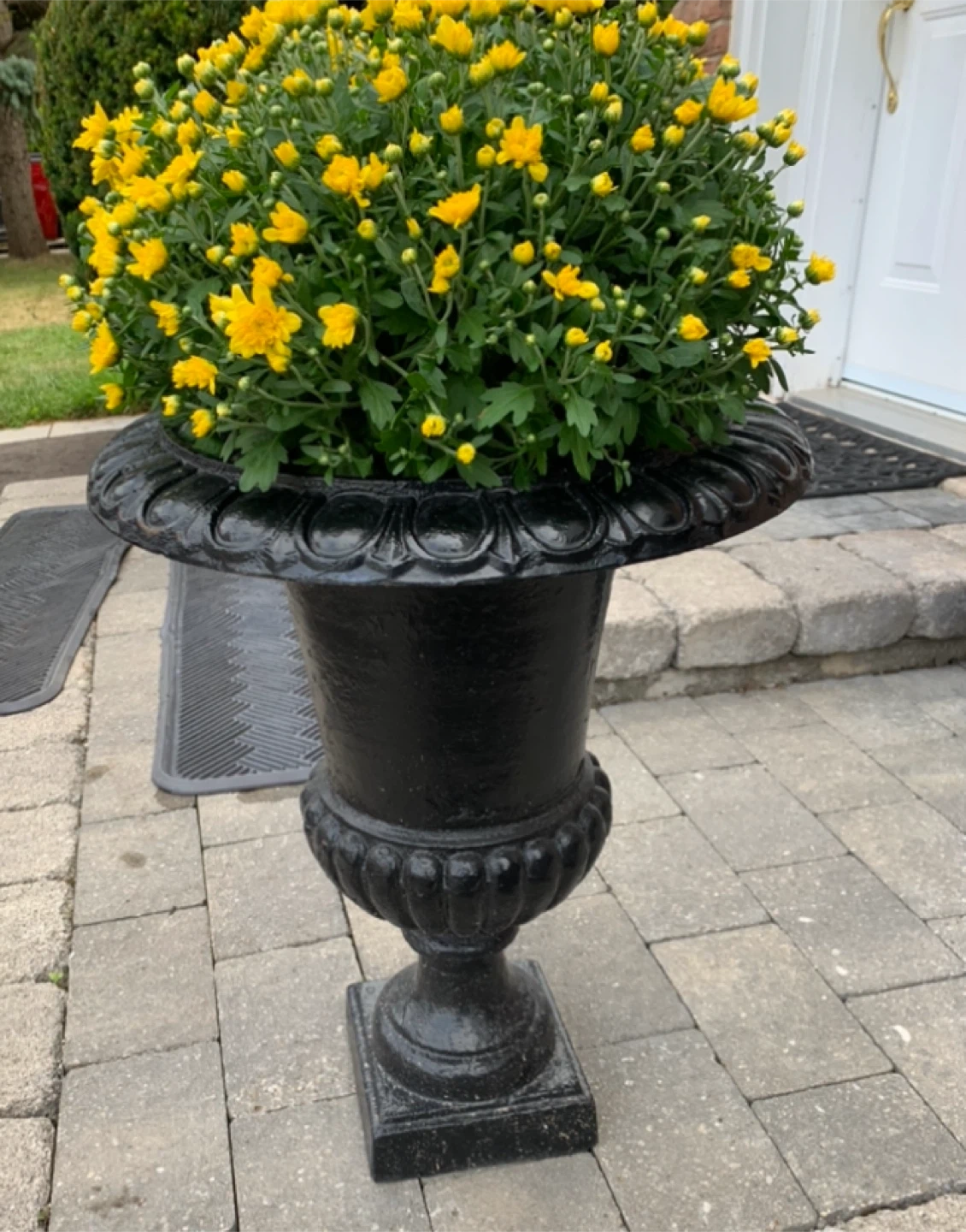 Large vintage heavy cast iron urn garden planter. 24” tall, solid cast iron. Egg and dart design. Will take 10” planter pot or plant directly in urn. Excellent condition. No chips or damage.