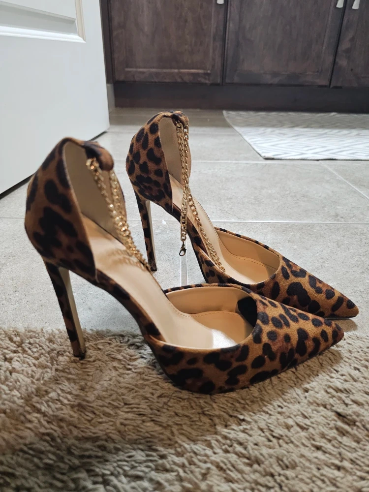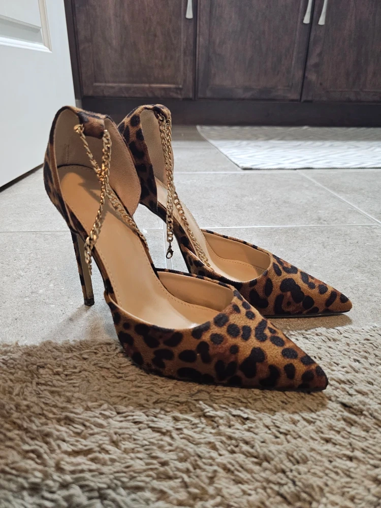 Stylish leopard print heels with a delicate gold chain detail! These heels are a size 8 and would be a great addition to your wardrobe. They come with the box, so they'll be easy to store or gift
