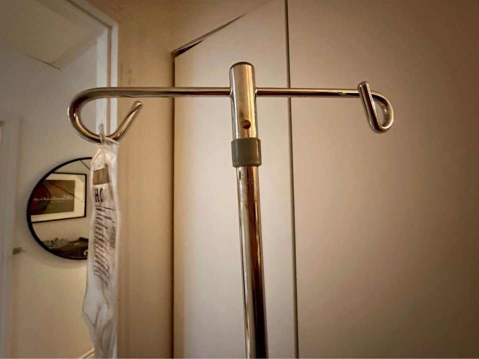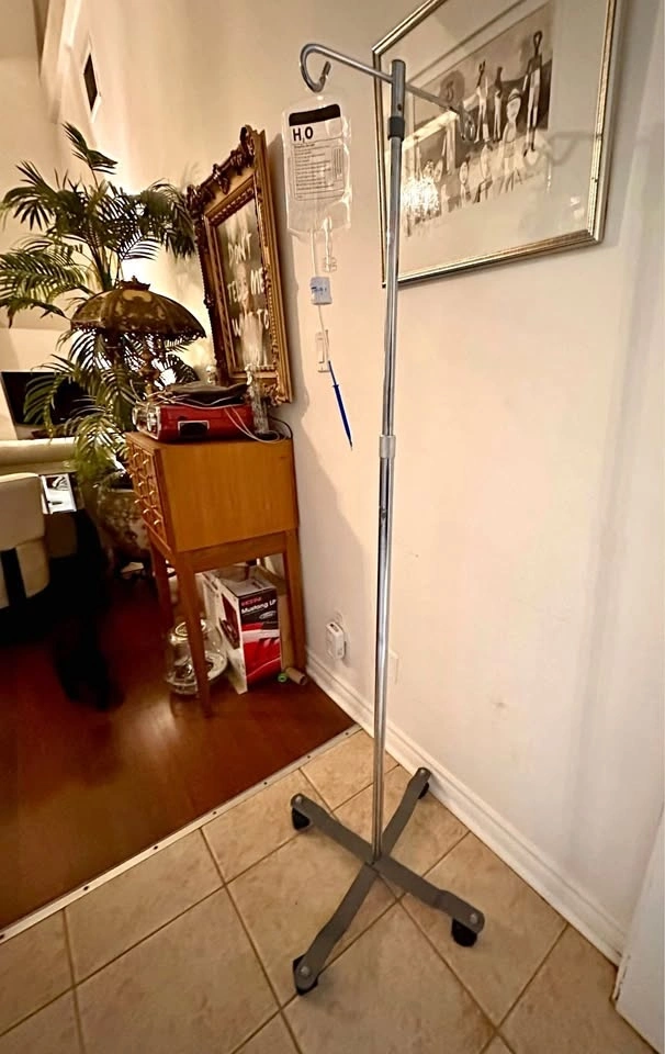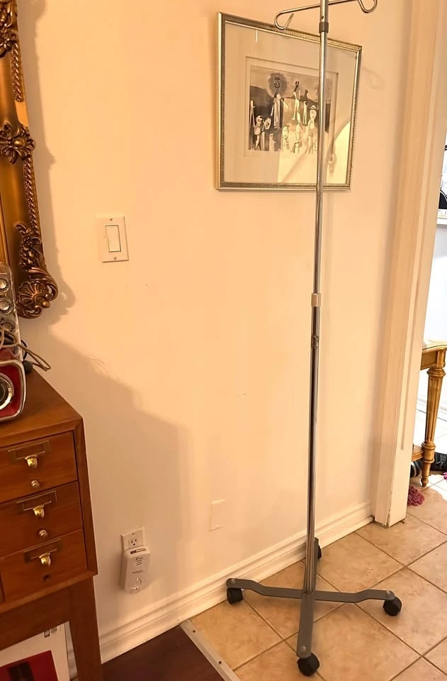 Adjustable rolling IV pole. Bought to hang plant watering bags (one bag seen in photo, not included but available on Temu ).