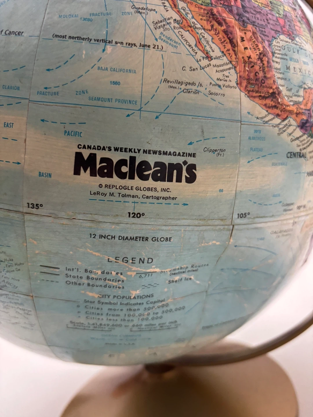 Classic 1970s–80s Replogle world globe made for Maclean’s magazine. Original stand, smooth spin, and a retro look with some age-wear. Perfect for décor or collectors.