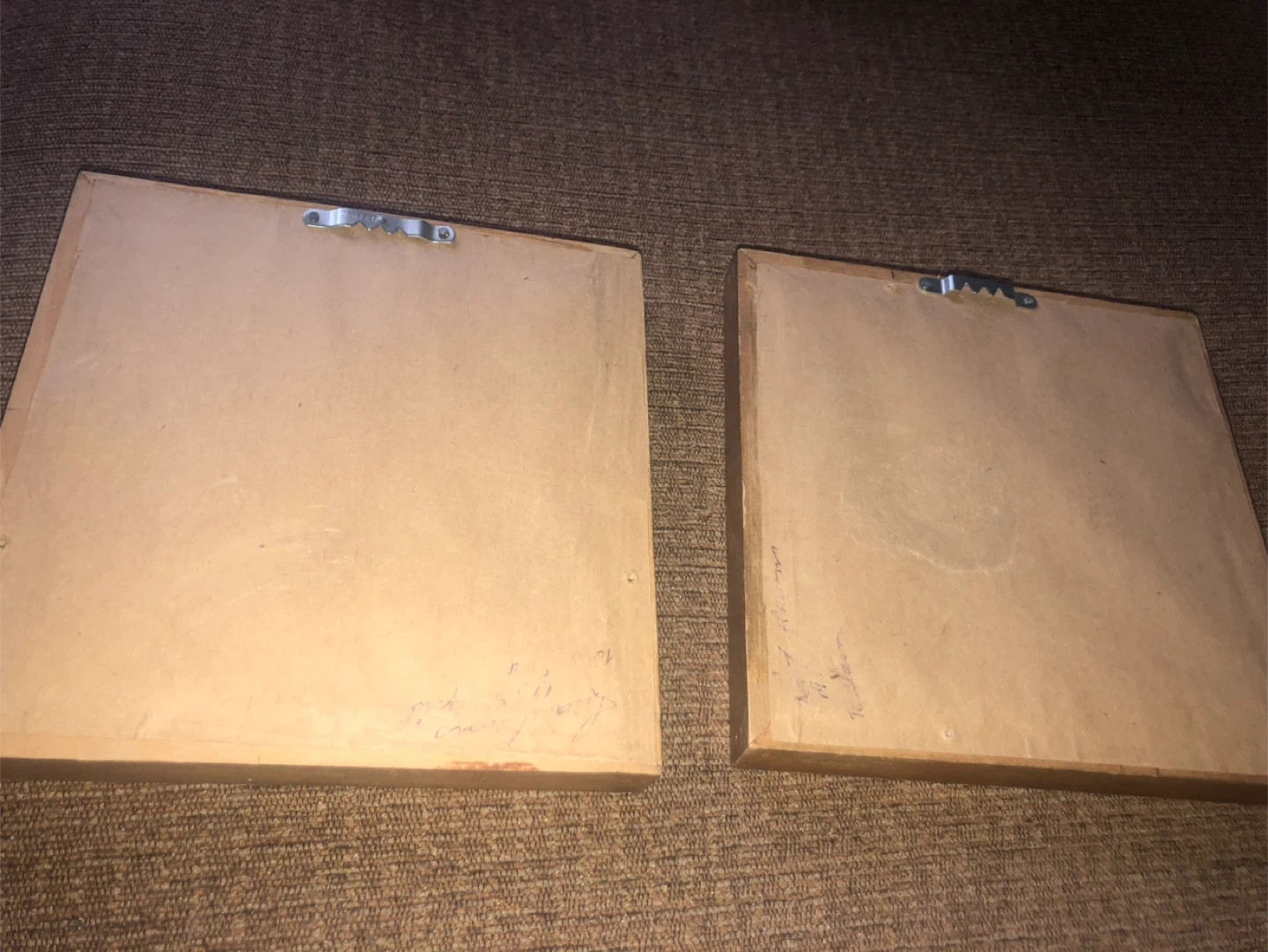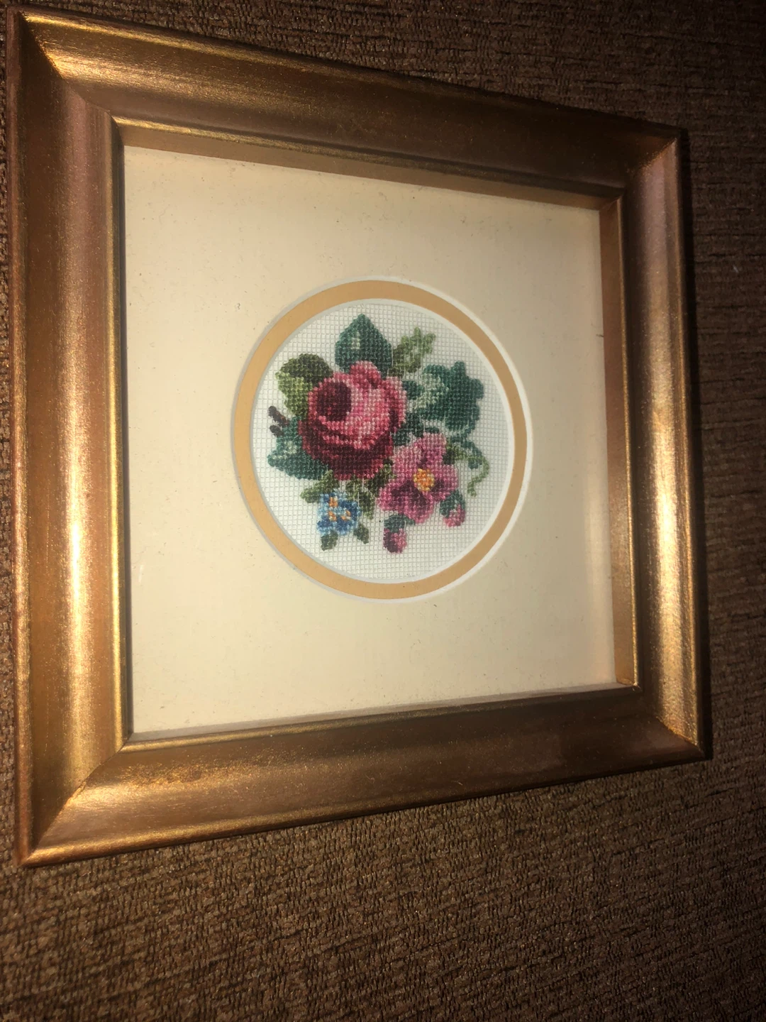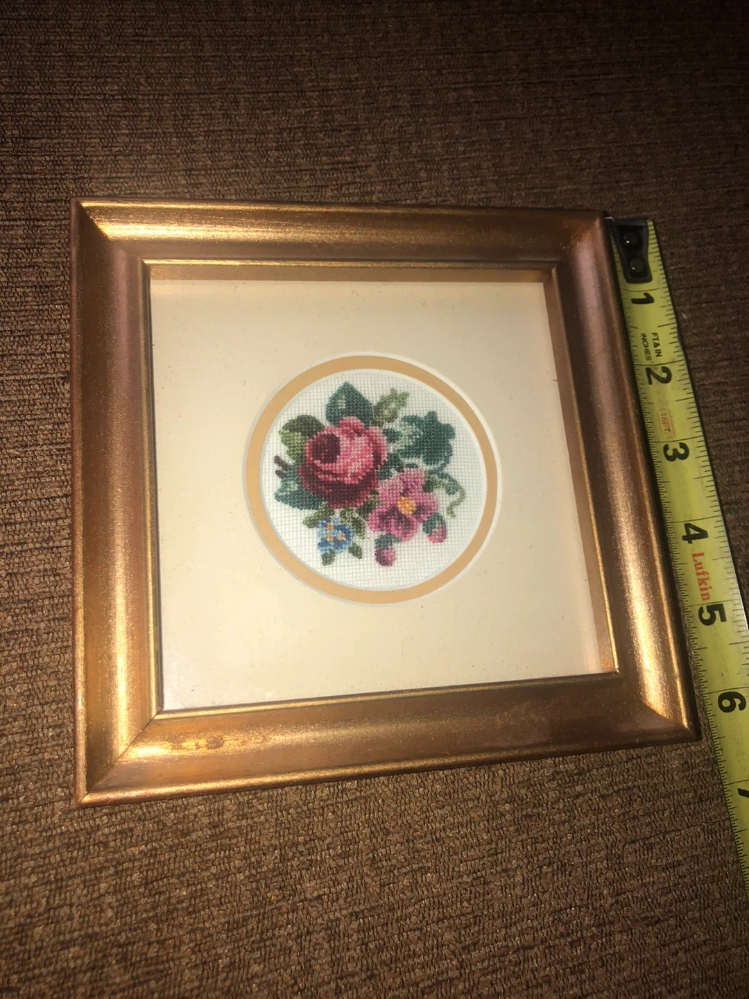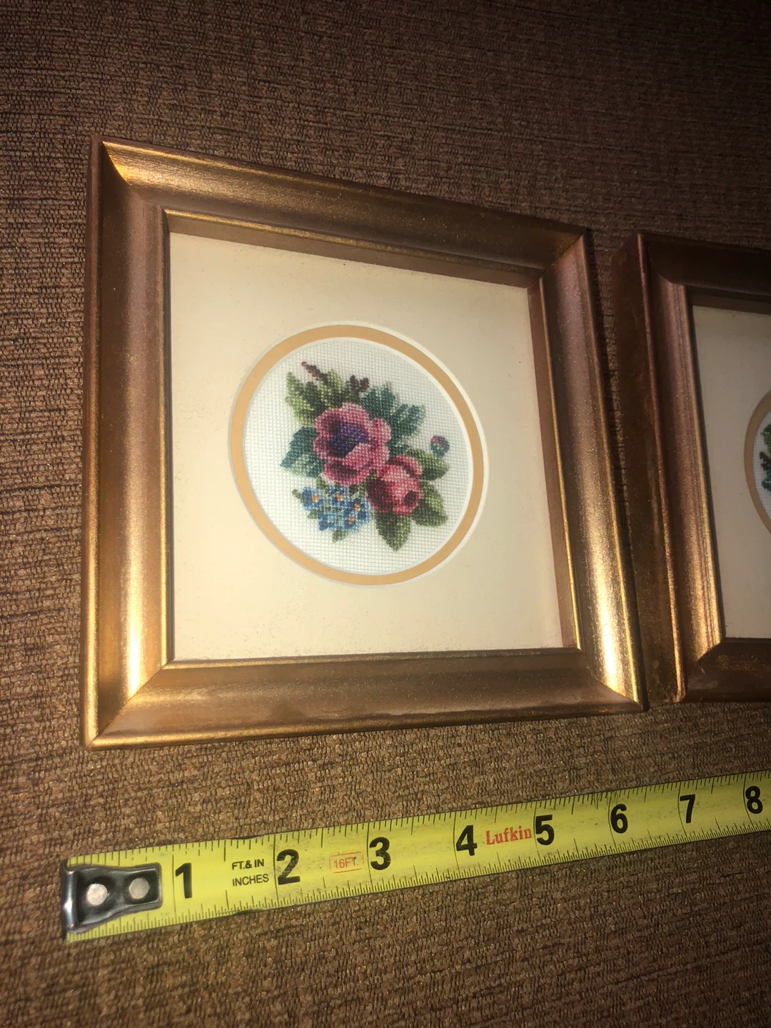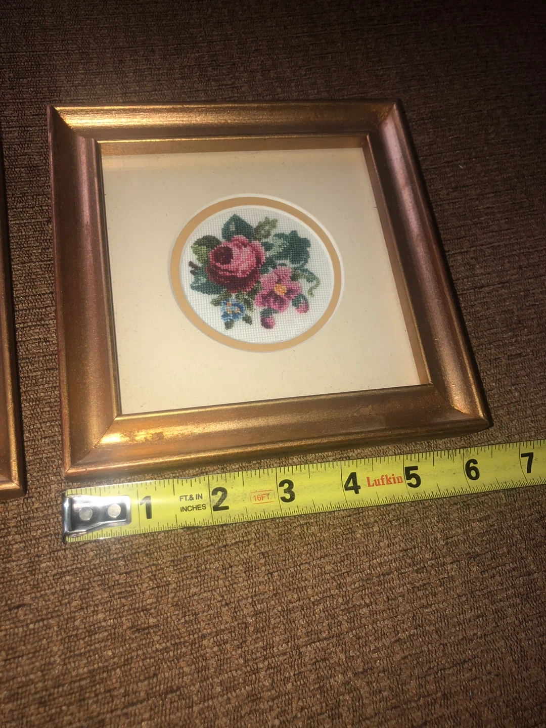Here are two framed floral needlepoint artworks. They each feature a lovely rose design in a gold-tone frame. The frames are approximately 5 inches square.