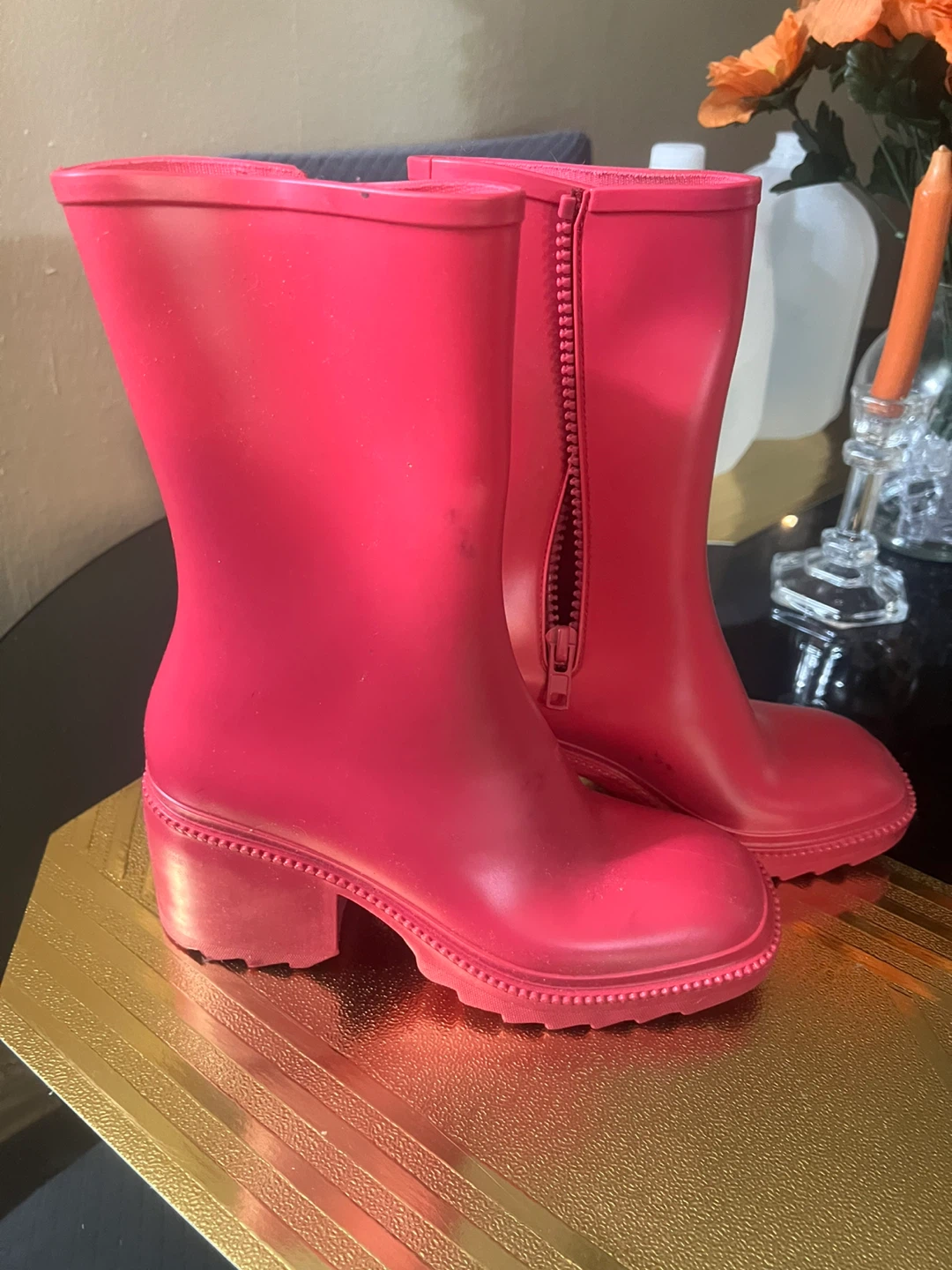 These are a pair of pink rain boots from INC International Concepts. They feature a zipper on the side and a block heel. Great for adding a pop of color on rainy days!
