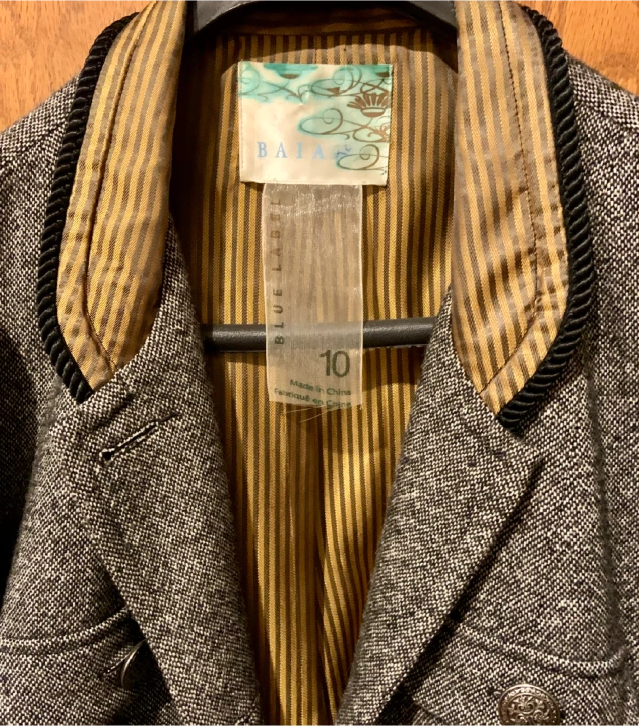 Selling a Baias Blue Label tweed jacket in a size 10. It's a stylish piece with a unique design. The jacket is in great condition and ready for a new home! Light fall jacket.