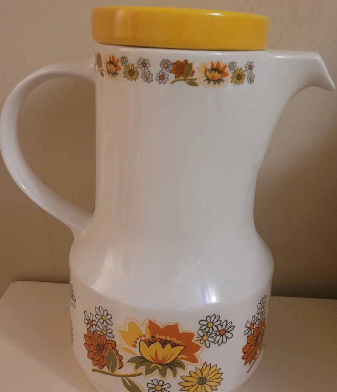 Selling a charming vintage carafe featuring a delightful floral design and a sunny yellow lid! It's perfect for adding a touch of retro flair to your kitchen or dining area. It's in great shape and ready to brighten up your day
