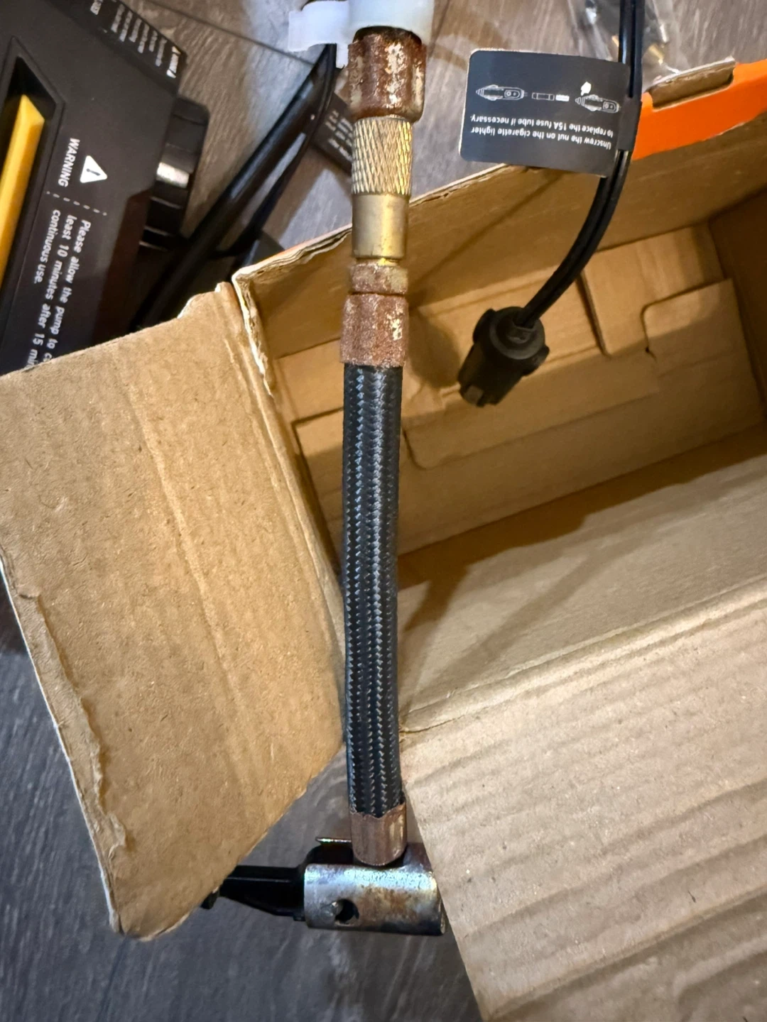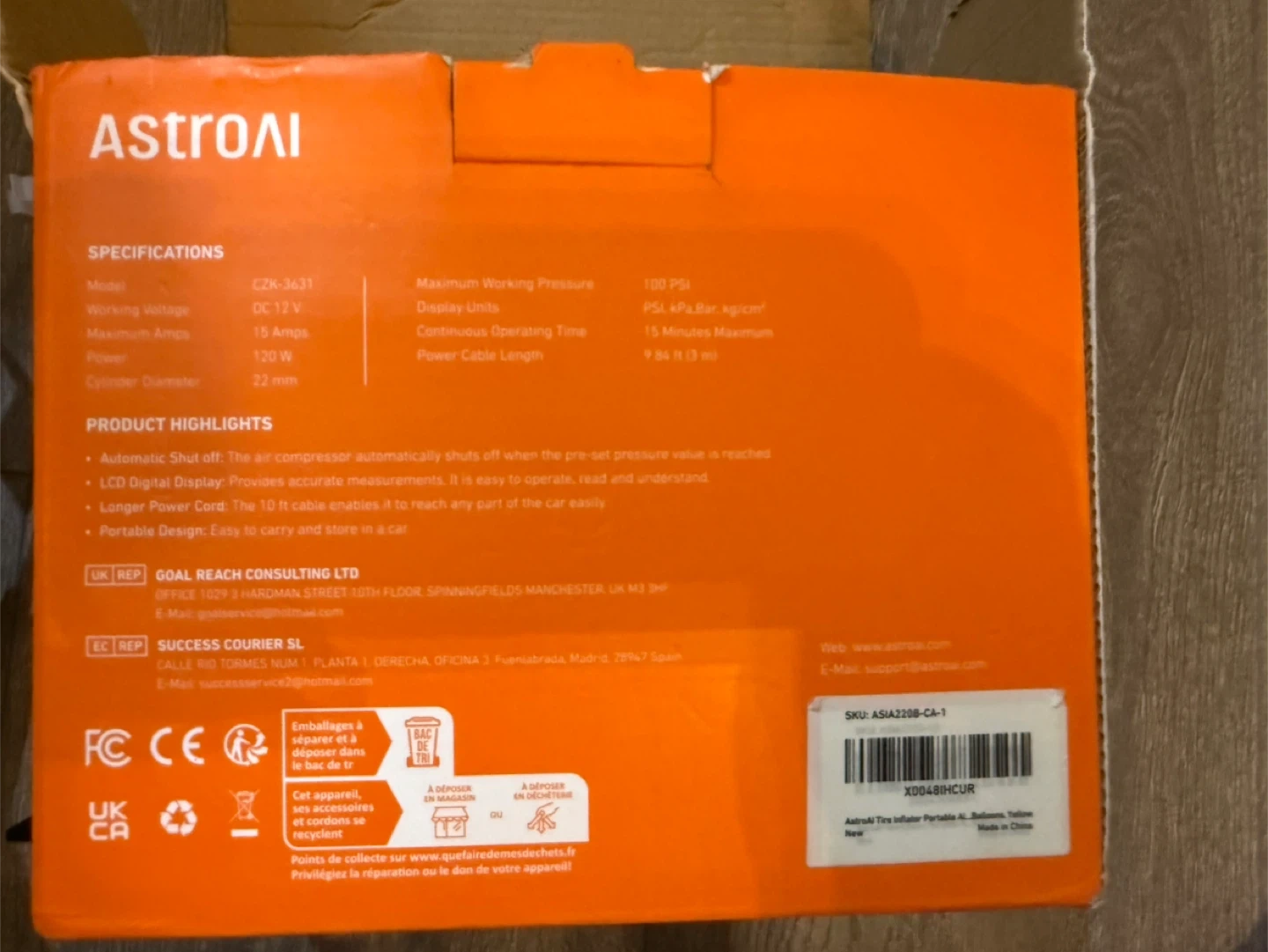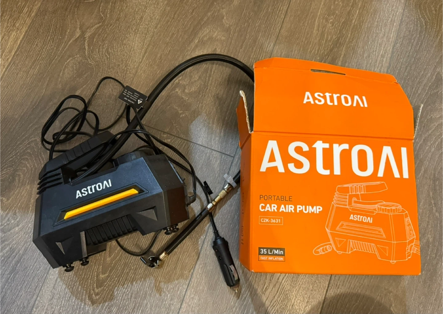 Selling an AstroAI portable car air pump. It comes with its original box and accessories. The model number is CZK-3631. It has an LCD digital display and a 10 ft cable.