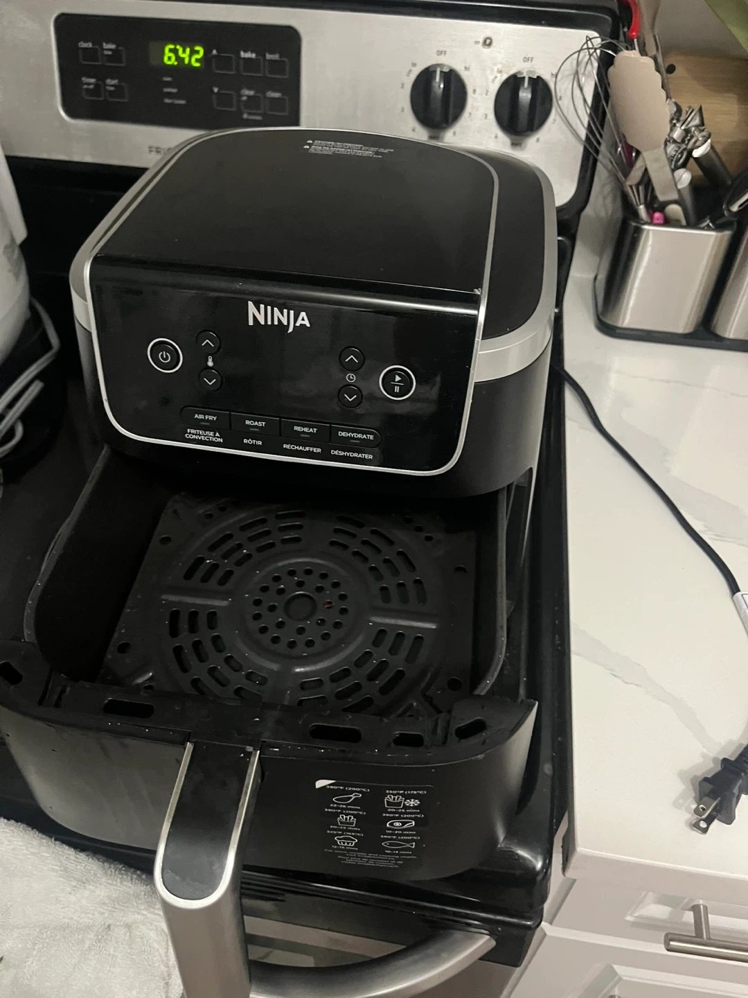 It's in great condition and ready to help you make some delicious meals! It features multiple cooking functions like air frying, roasting, reheating, and dehydrating. The basket is easy to clean, making it super convenient for everyday use