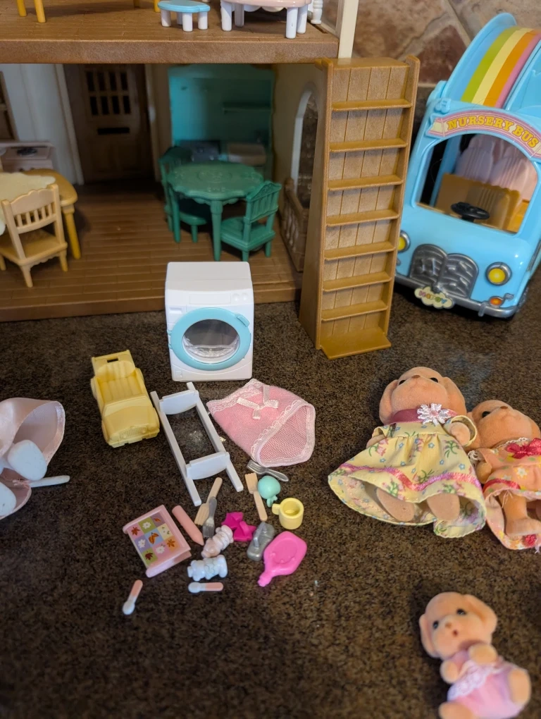 Selling a Calico Critters dollhouse with furniture and critter figures. It's in great condition and ready for a new home. Includes a variety of furniture pieces and cute critter families to fill the house