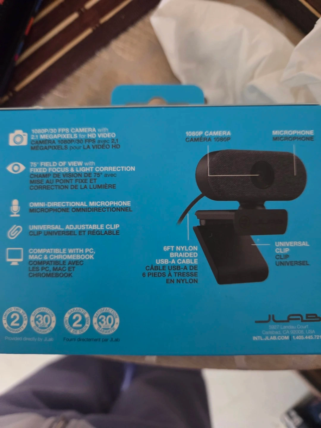 This JLab GO CAM offers 1080p HD video calls with a 2.1 megapixel camera. It features a 75-degree field of view and an omni-directional microphone. The webcam includes a universal clip for easy mounting and a 6ft braided USB-A cable.