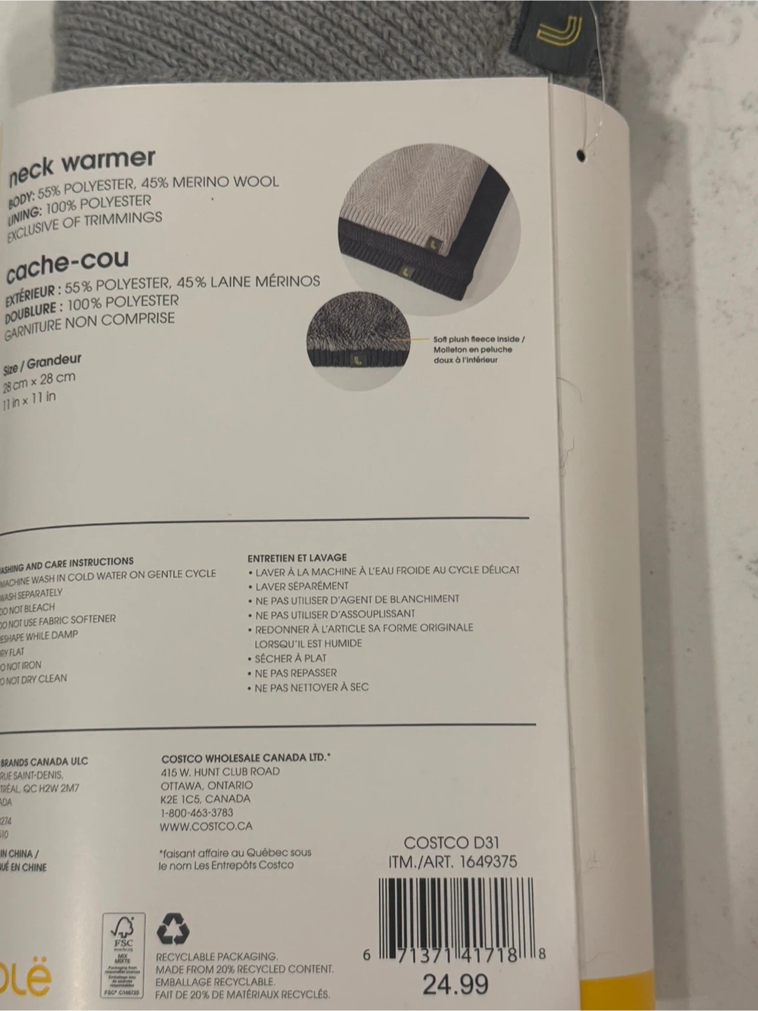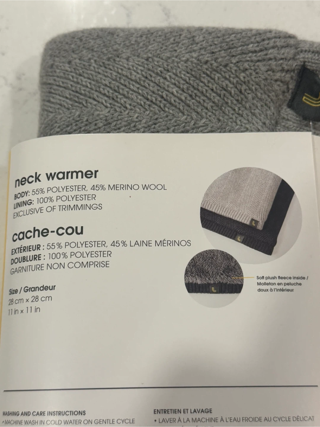 Keep cozy with this Lolë neck warmer! It's made of 55% polyester and 45% merino wool, with a 100% polyester lining. The size is 11 in x 11 in.