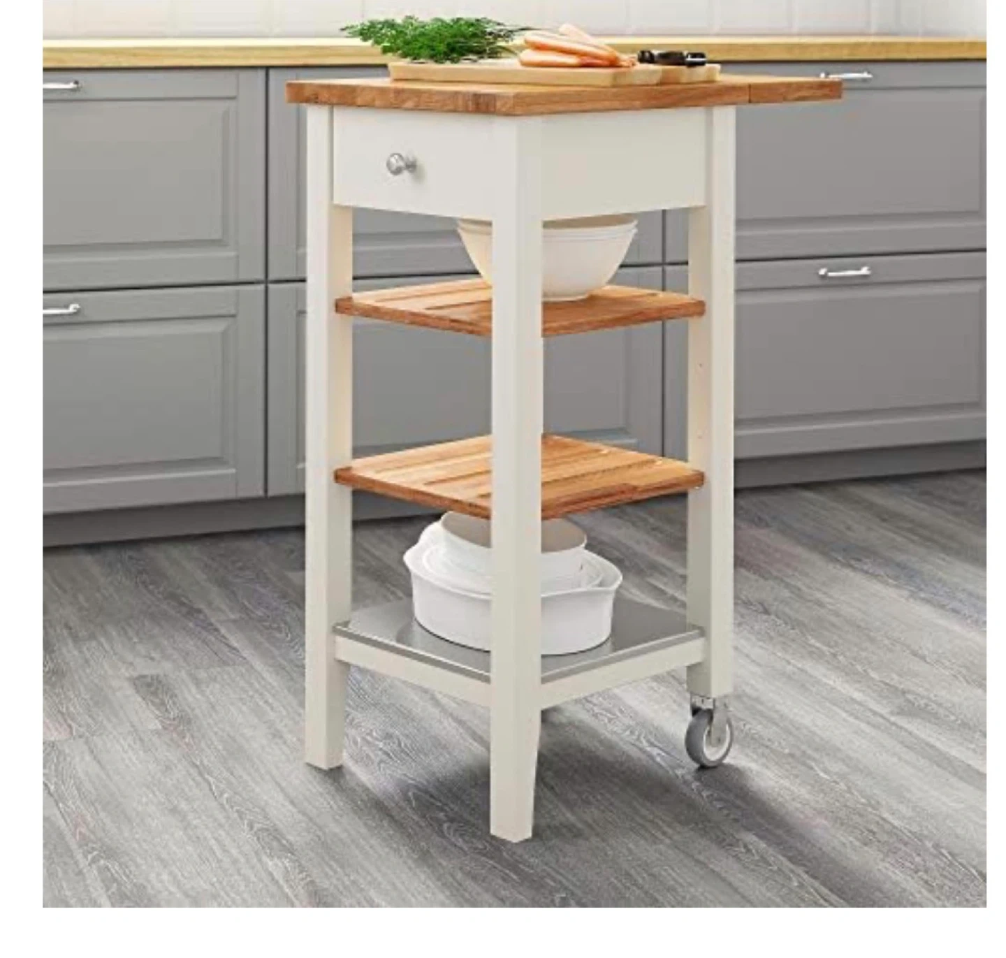 Selling an IKEA Stenstorp kitchen cart! It's white with a wood top and has a drawer and shelves for storage. Great for adding extra counter space in your kitchen or as a serving cart
