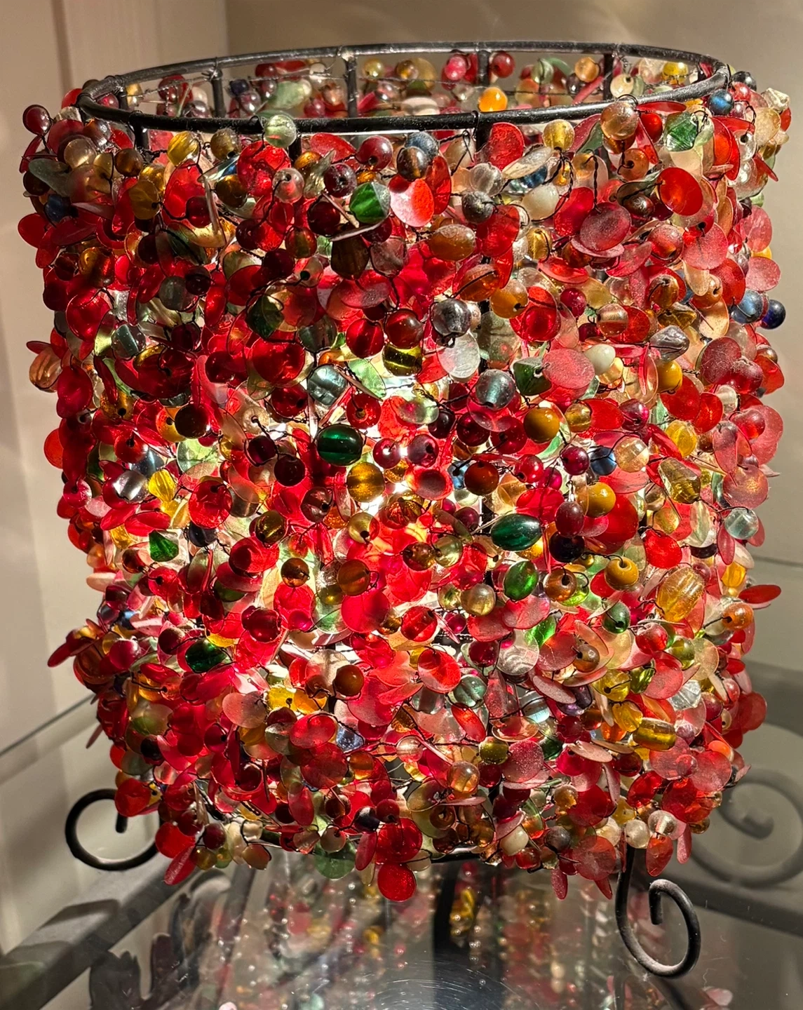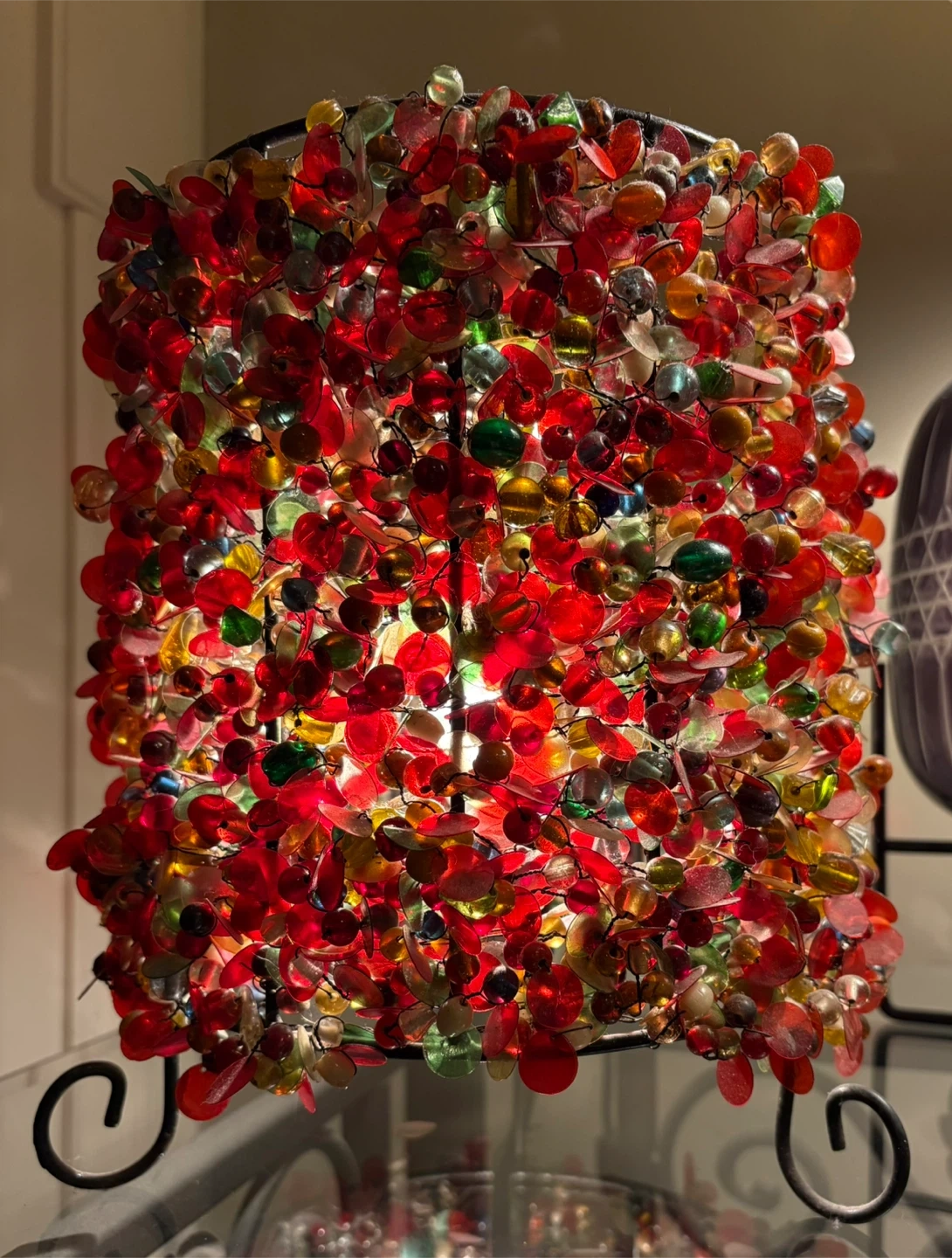 This table lamp features a shade adorned with colourful capiz shells. It gives off a warm and inviting glow, perfect for adding a touch of whimsy to any room! Bulb included. 10”X 8” 😊