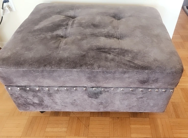 This is a grey ottoman that would look great in any living room! It has nailhead trim along the bottom. There are some signs of wear.