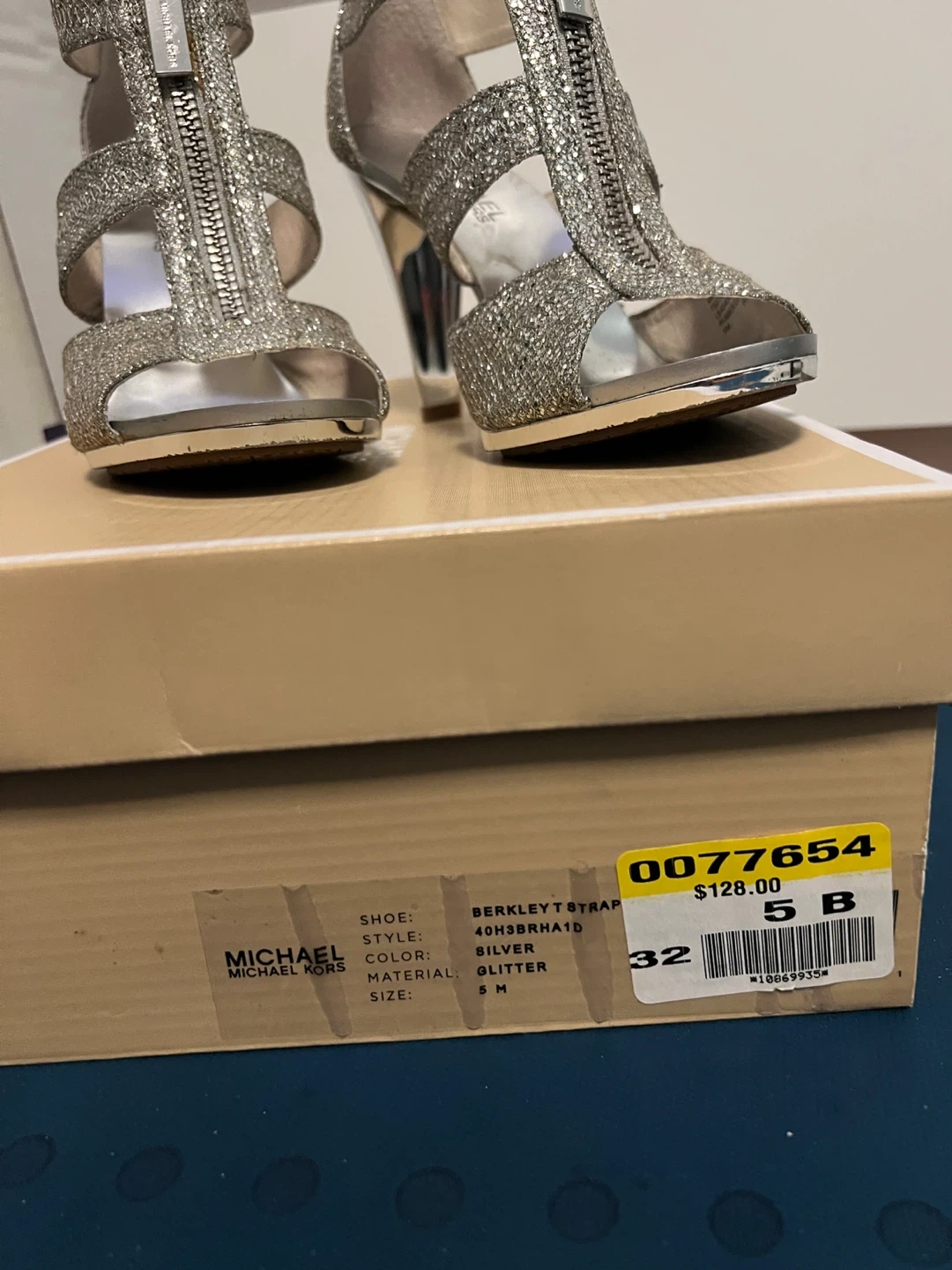 These sparkly Michael Kors heels are sure to turn heads! They feature a unique zipper detail that are functional and easy to slip on and off. A glittery finish that is in the fabric so it never leaves a mess. Comes with the original box!