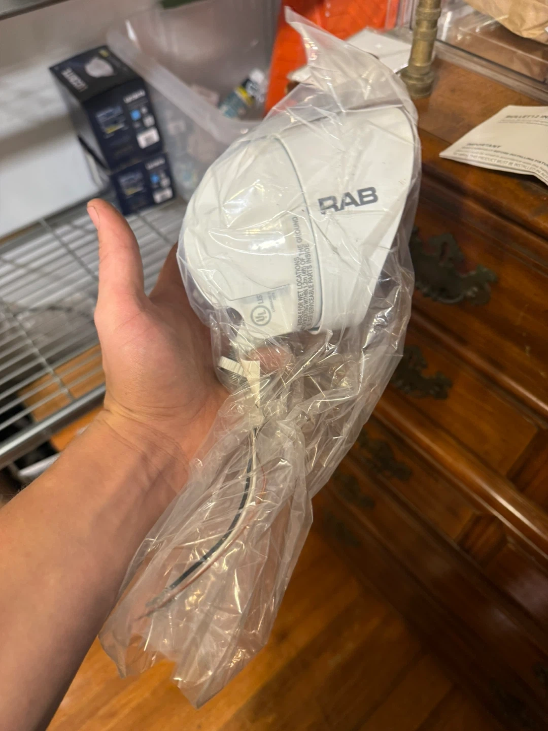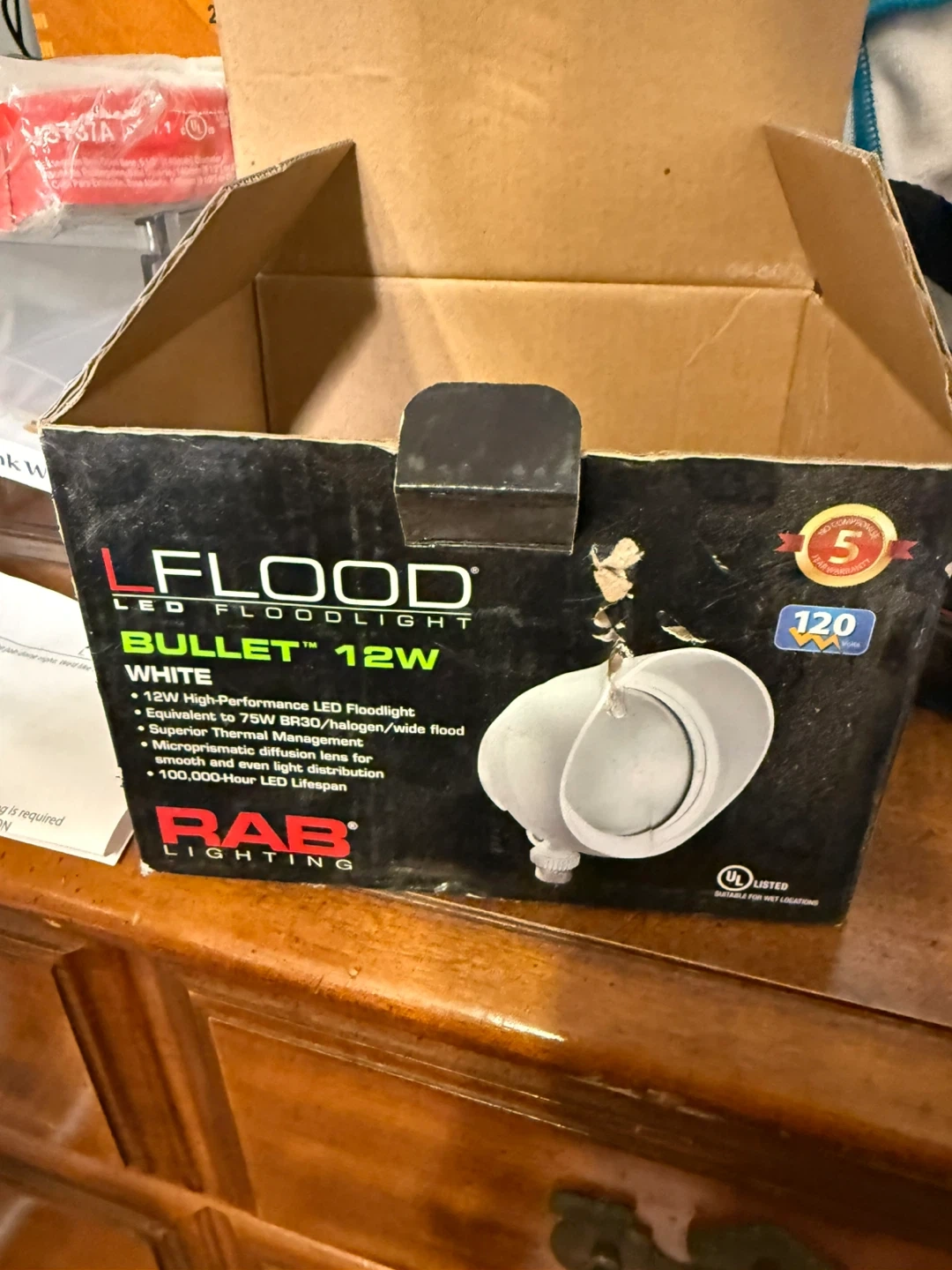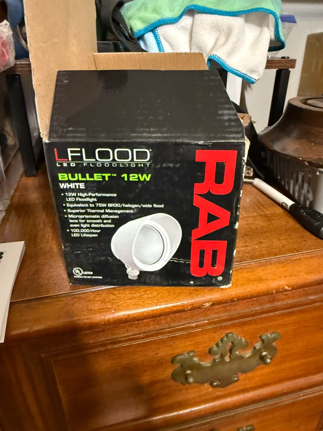 Selling a RAB Flood Bullet 12W LED Floodlight in white. It's a high-performance LED floodlight equivalent to 75W BR30/halogen/wide flood with superior thermal management. It also features prismatic diffusion lens for smooth and even light distribution and has a 100,000-hour LED lifespan. Installation instructions are included in the box.