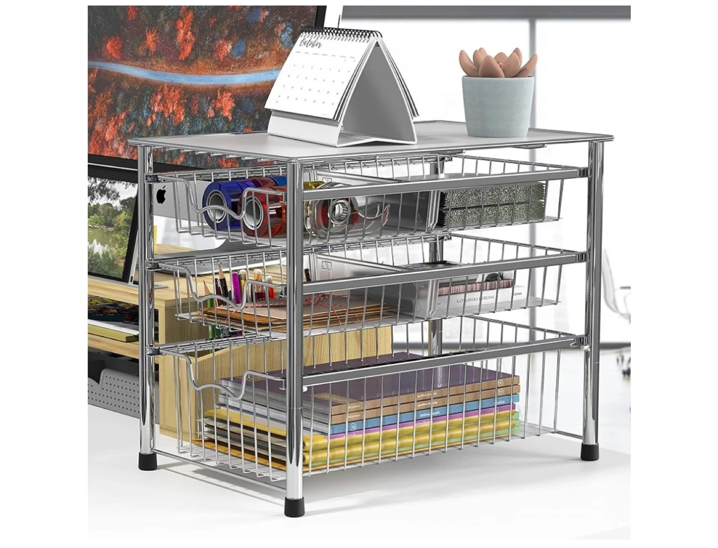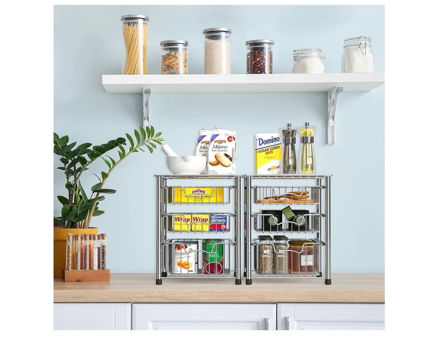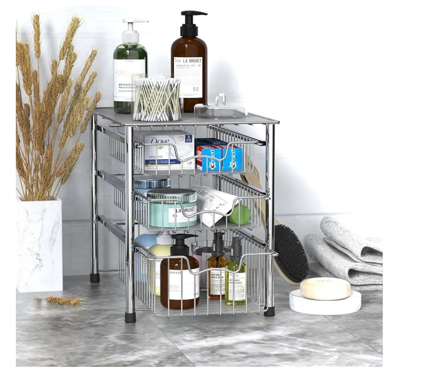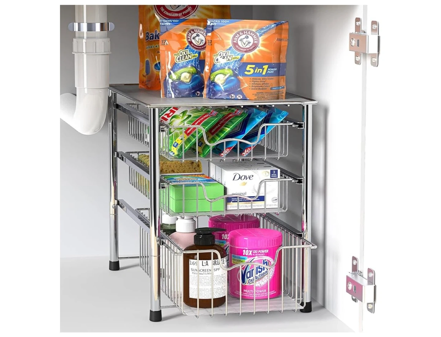 Declutter your space with this handy under-sink organizer! It features pull-out baskets for easy access and a stackable, non-slip design. The dimensions are approximately 11" wide x 16.75" deep x 13.75" high, making it a great fit for under sinks or in other tight spaces