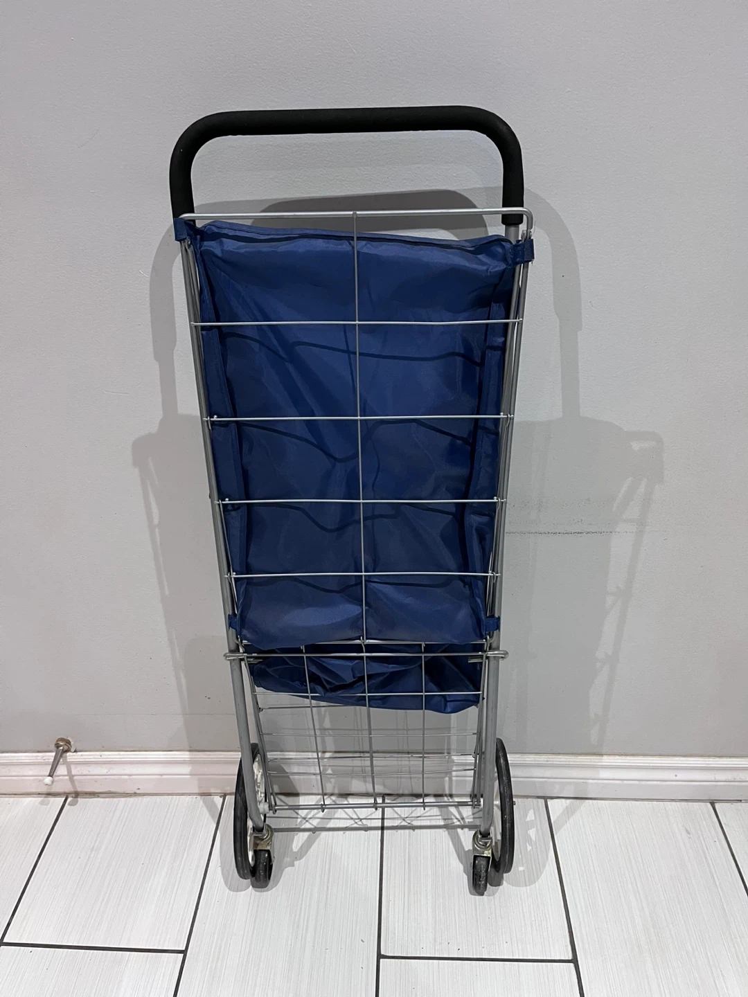 Navy blue rolling laundry or shopping cart. It’s in great shape. Sturdy Metal frame and folds up for convenience.