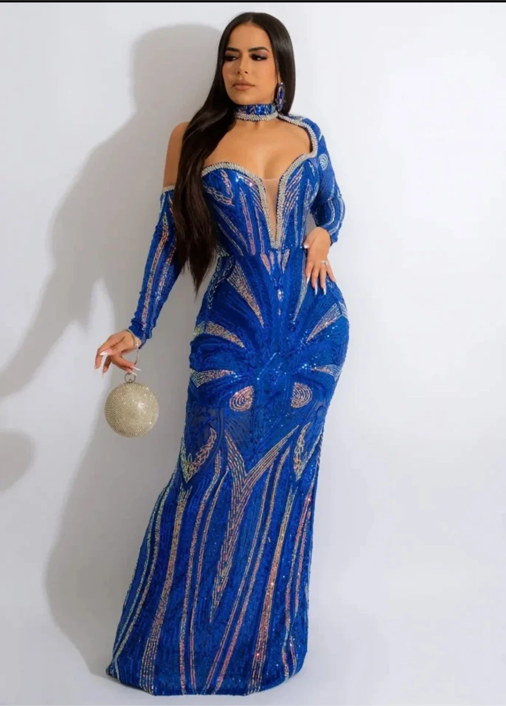 This is a stunning blue sequin evening gown, perfect for a special occasion! The dress features long sleeves and a unique design. It is Brand New and ready to make you shine at your next event