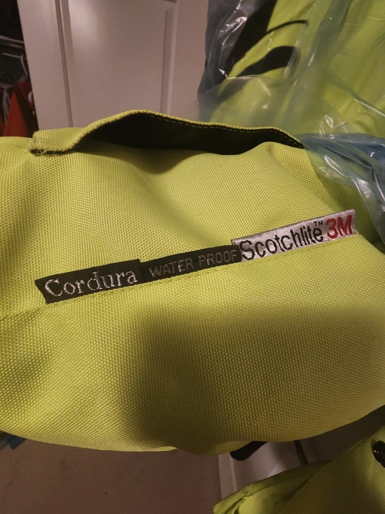 Selling a high visibility motorcycle jacket! It features Cordura fabric, making it waterproof. It also has Scotchlite 3M reflective material for added safety.