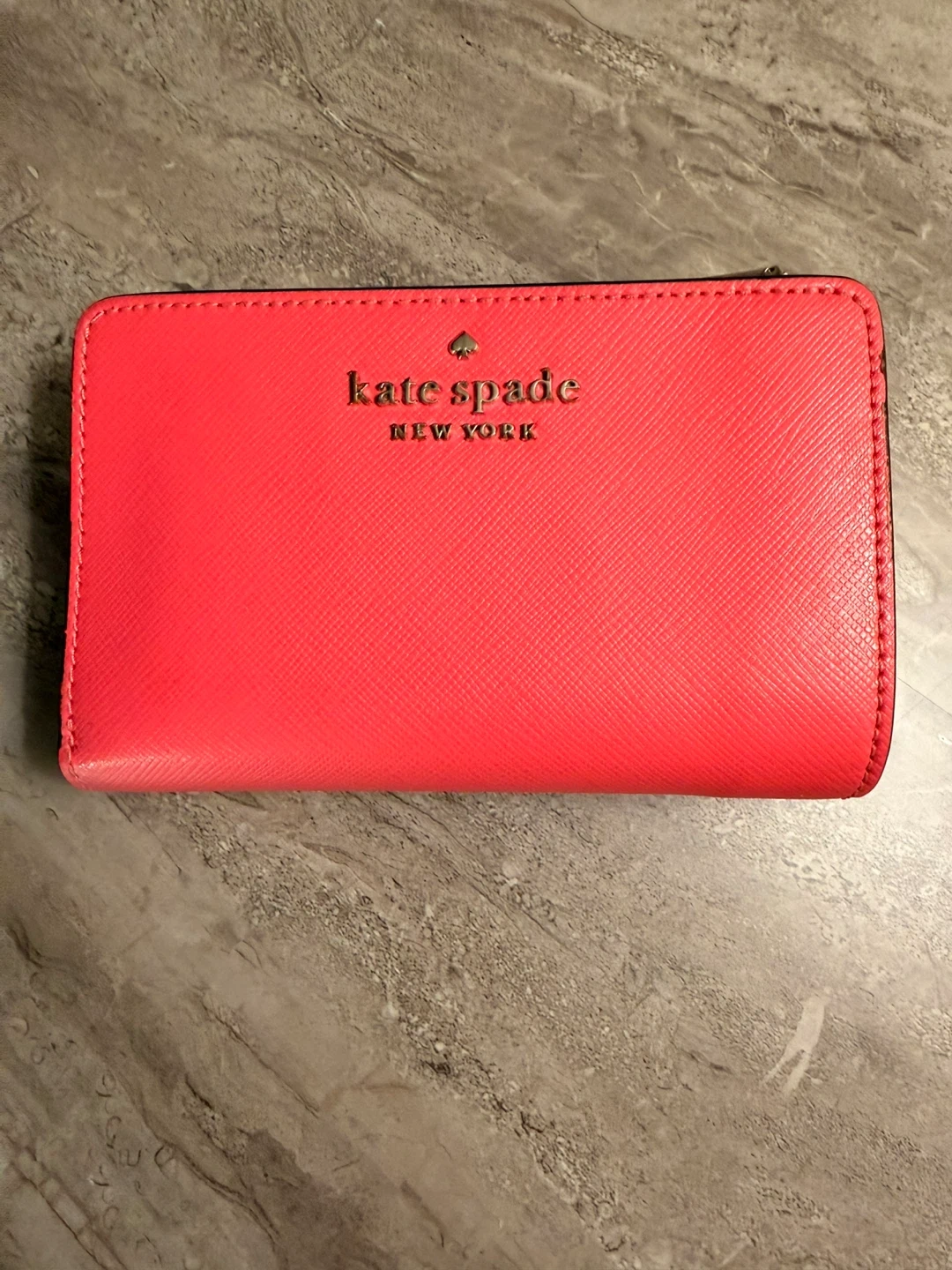 A lovely coral Kate Spade wallet. It's in great condition and has lots of space for cards and cash!