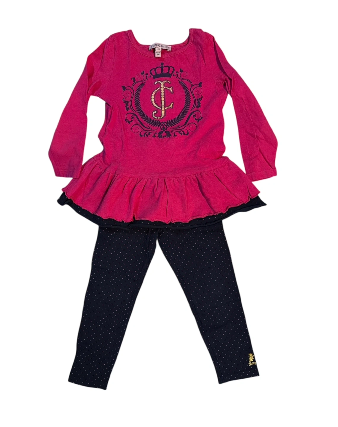 A cute Juicy Couture two-piece outfit for kids! This set includes a long-sleeved pink top with the Juicy Couture logo and a pair of navy blue leggings with polka dots. The size is 3T, perfect for toddlers. In very good condition.