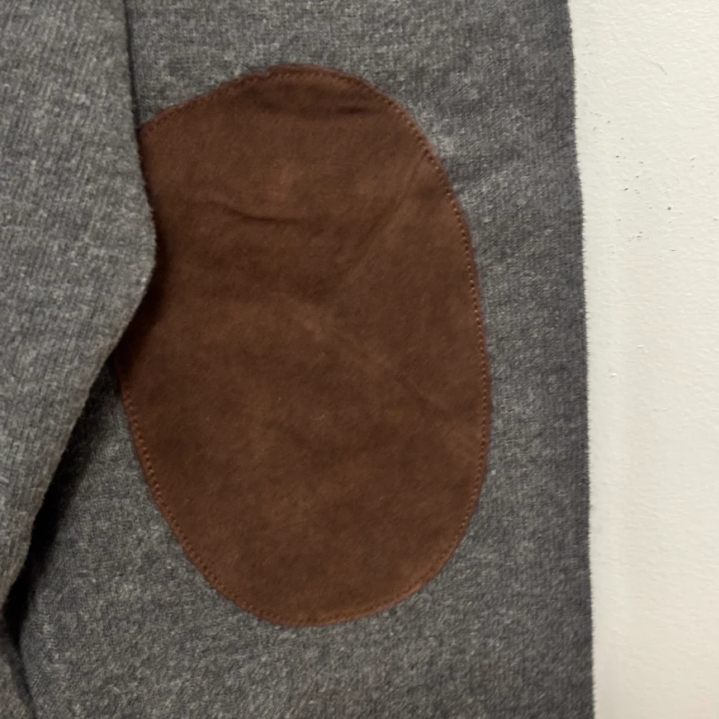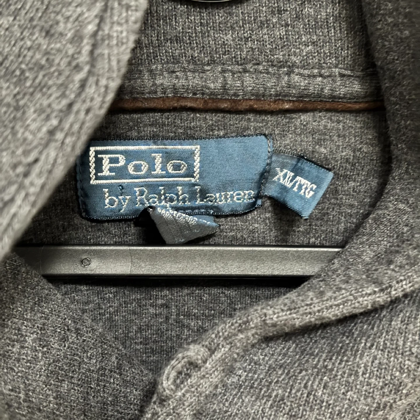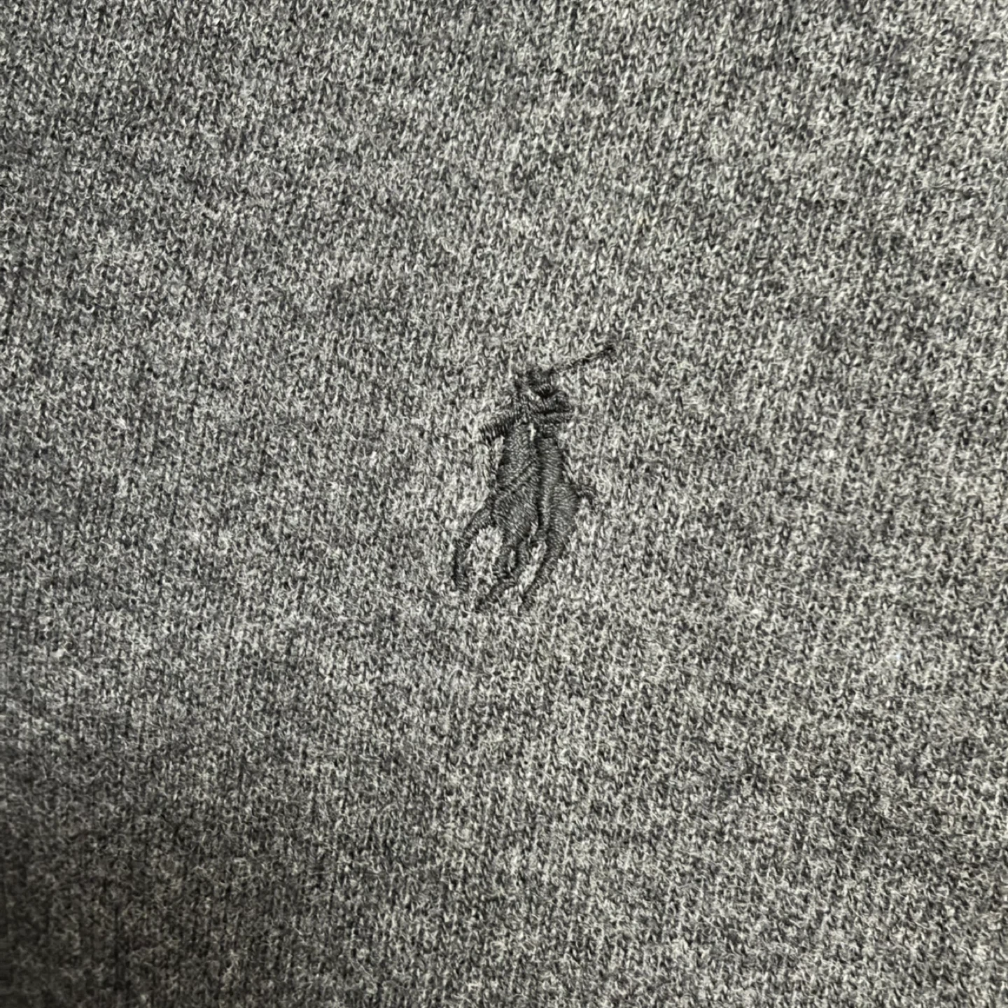 Selling a Ralph Lauren Polo sweater in grey. It's a size XXL and features stylish elbow patches. There's a small stain on one of the elbow patches, as shown in the photos.