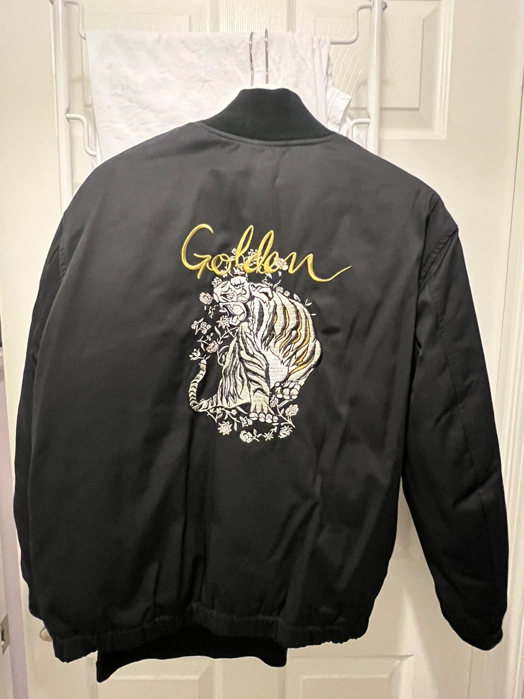 Selling a Golden by Tna bomber jacket in black, size medium. It features a stylish design with embroidery on the front and a larger graphic on the back. Great for adding a touch of flair to your wardrobe!