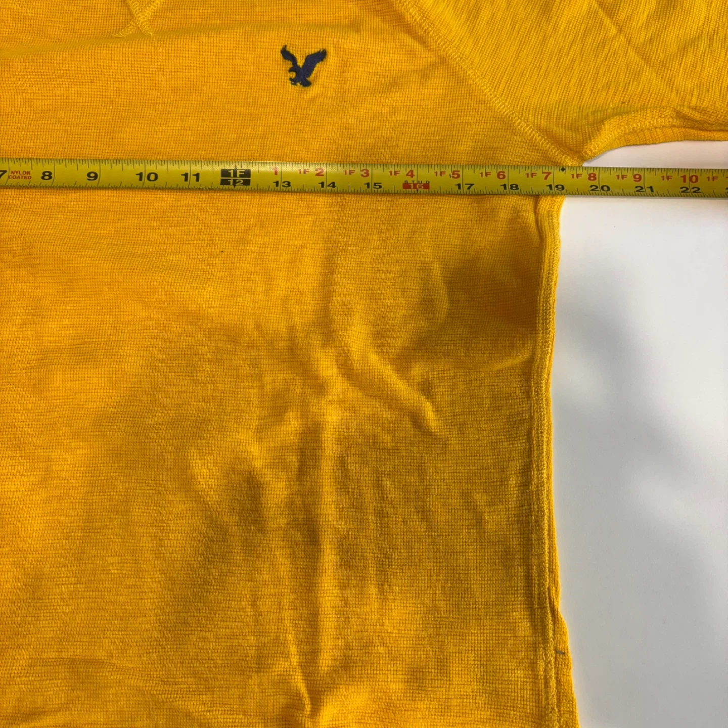 Selling an American Eagle Heritage thermal long sleeve shirt in size M. It's a classic fit and made of a comfortable thermal material. The shirt is a vibrant yellow colour, perfect for adding a pop of colour to your wardrobe!