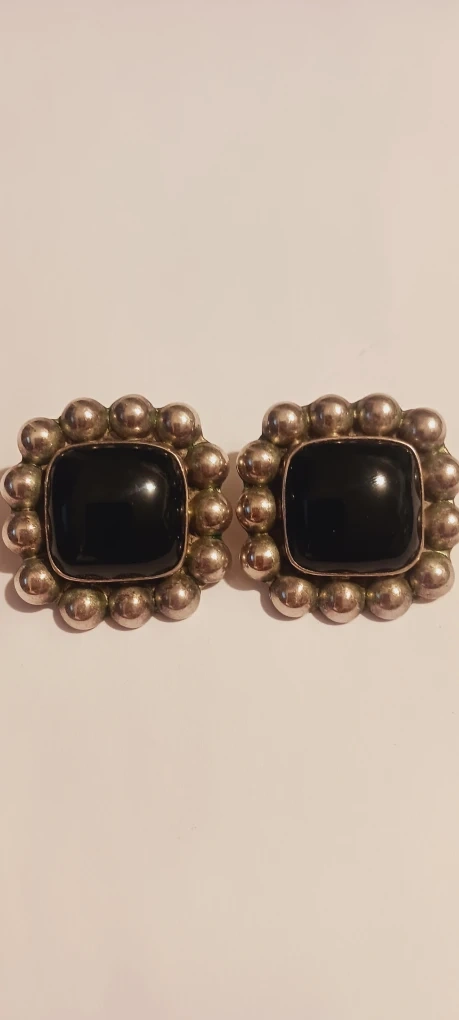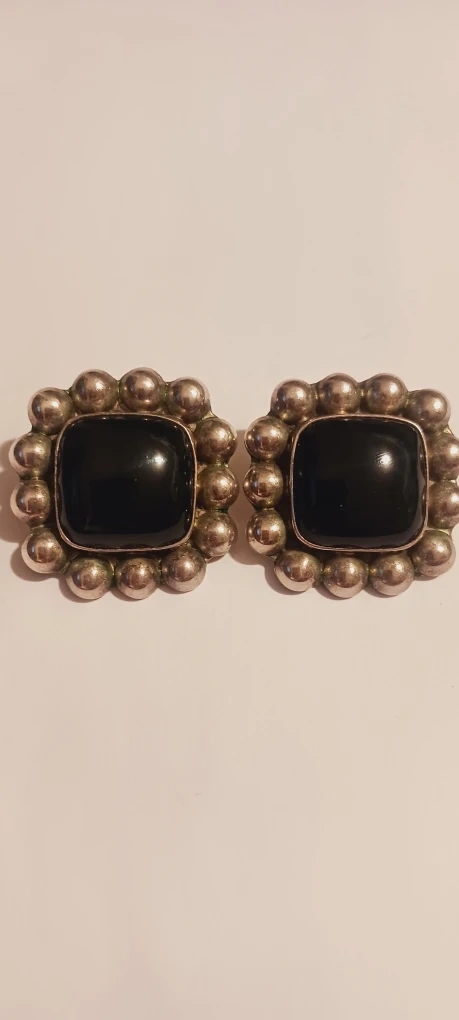Modernist Mexican Sterling Silver 925 Black Onyx Stone Clip-on Earrings. These are a pair of vintage earrings featuring a square black onyx stone surrounded by sterling silver 925 pebbled beads. They are in good condition and ready to be worn! 1.2"×1.2". Excellent condition. ALL MY PRICES ARE NEGOTIABLE !!