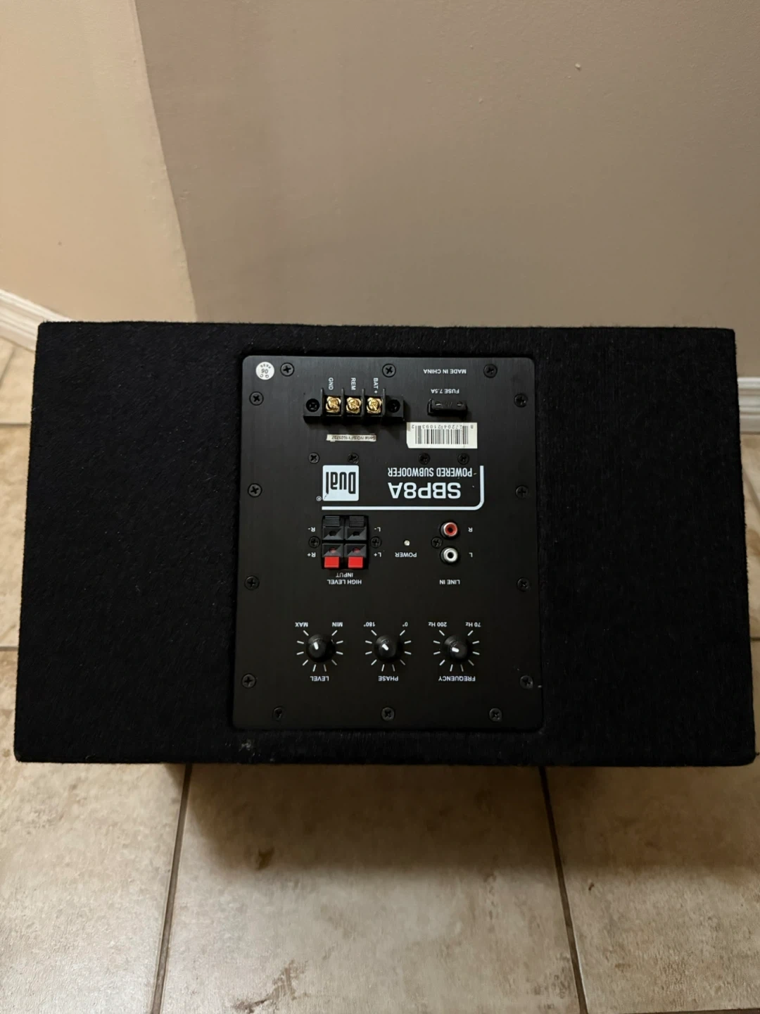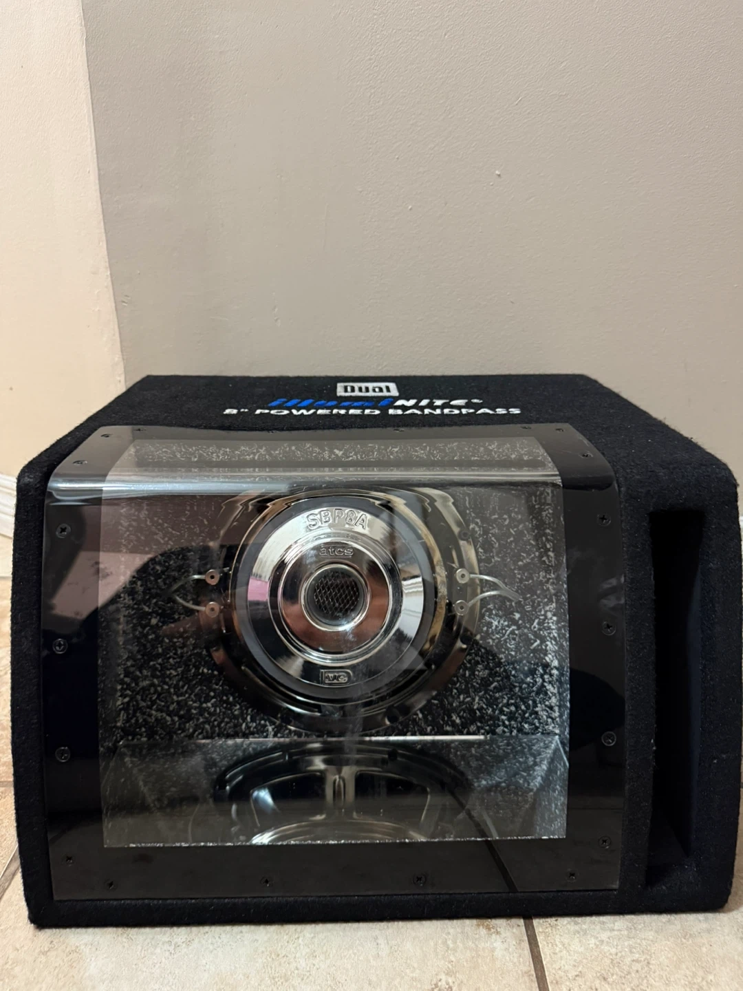 Selling a Dual IllumiNITE SBP8A 8" powered bandpass subwoofer. Couple scratches but thats it other than that its great and also has adjustable frequency so you can choose how you like your sound. Here and ready to add some bass to your car audio system!