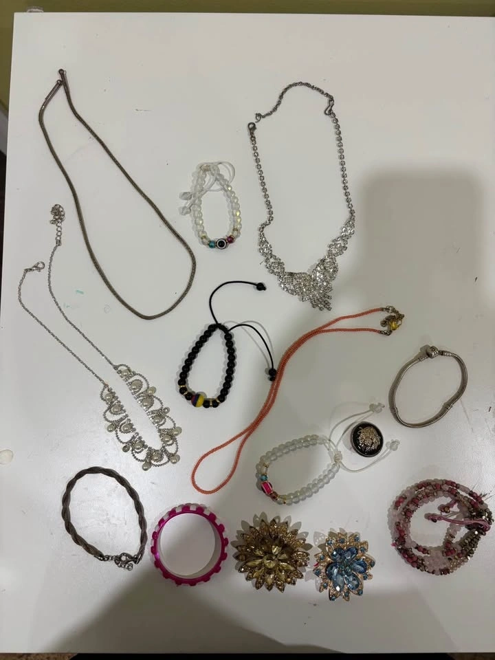 Jar filled with a variety of jewelry pieces including beaded bracelets, chain styles, and assorted accessories. A fun mix for someone who loves to style, repurpose, or create DIY projects.