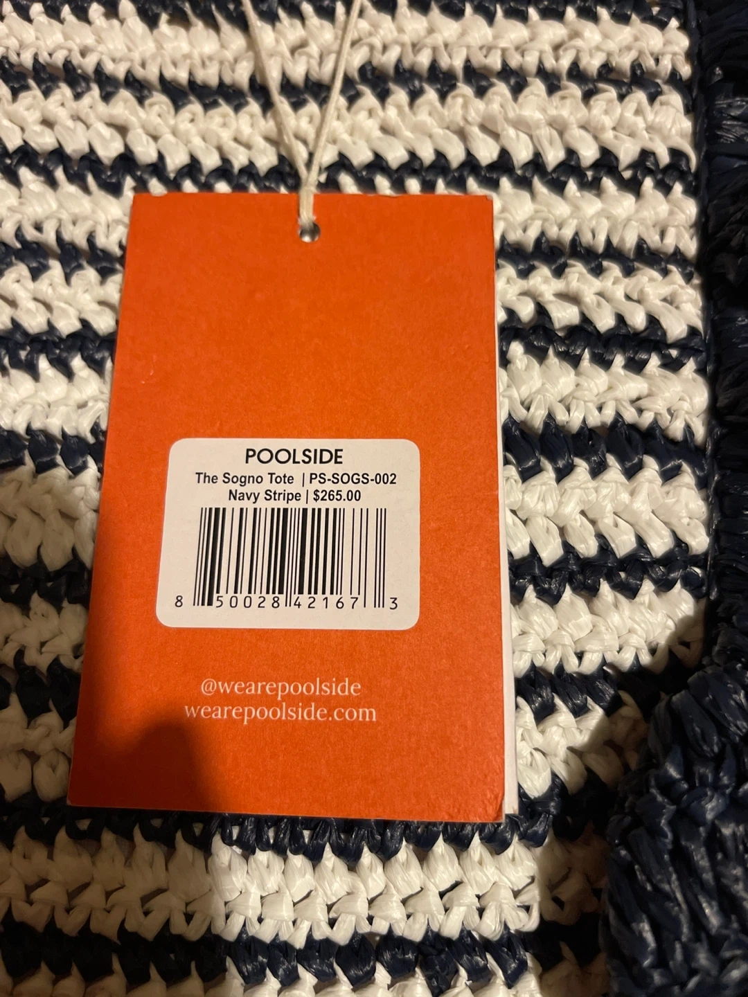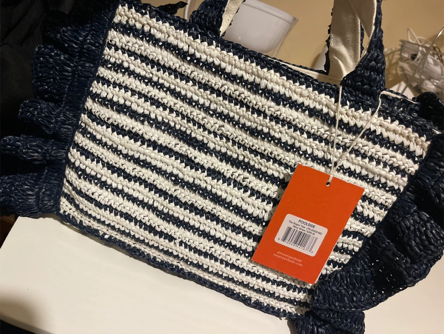 This is a Poolside tote bag featuring a stylish striped design with ruffled accents, perfect for adding a touch of elegance to your beach or poolside ensemble. It's brand new with tags.